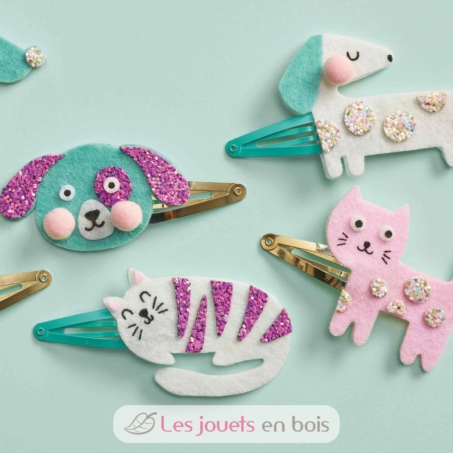 Este juego contiene: 6 barras de 5 cm, 3 hojas de fieltro autoadhesivo precortado, 2 hojas de purpurina autoadhesiva precortada, 3 pompones, puntos autoadhesivos de doble cara. No necesita pegamento. También se incluye un folleto con todas las instrucciones y modelos para reproducir con el contenido del kit. En total, tardarás 10 minutos en hacer un pasador, o alrededor de 1 hora en crear los 6.