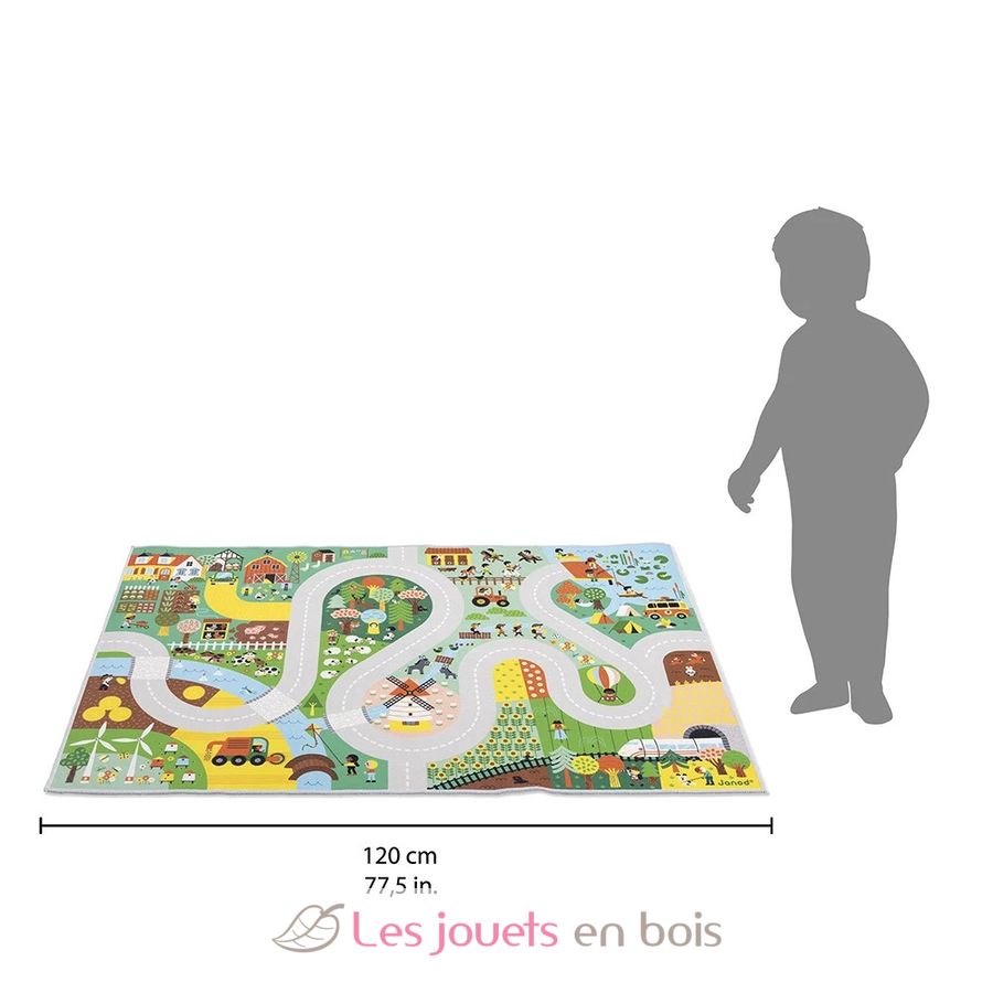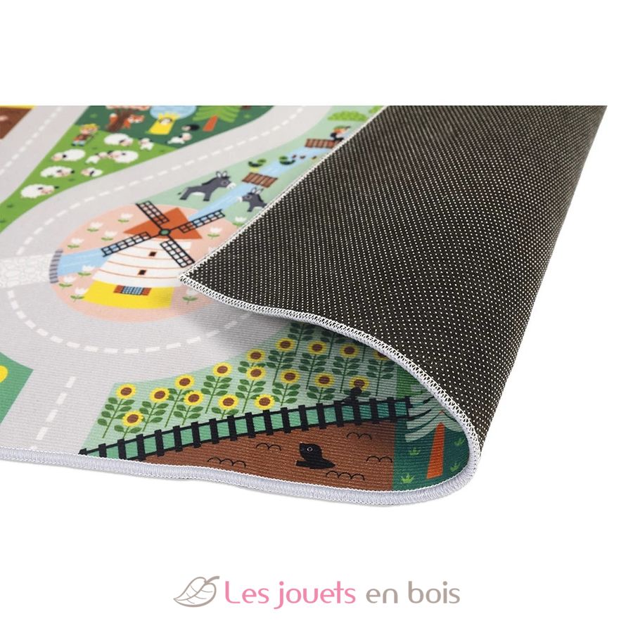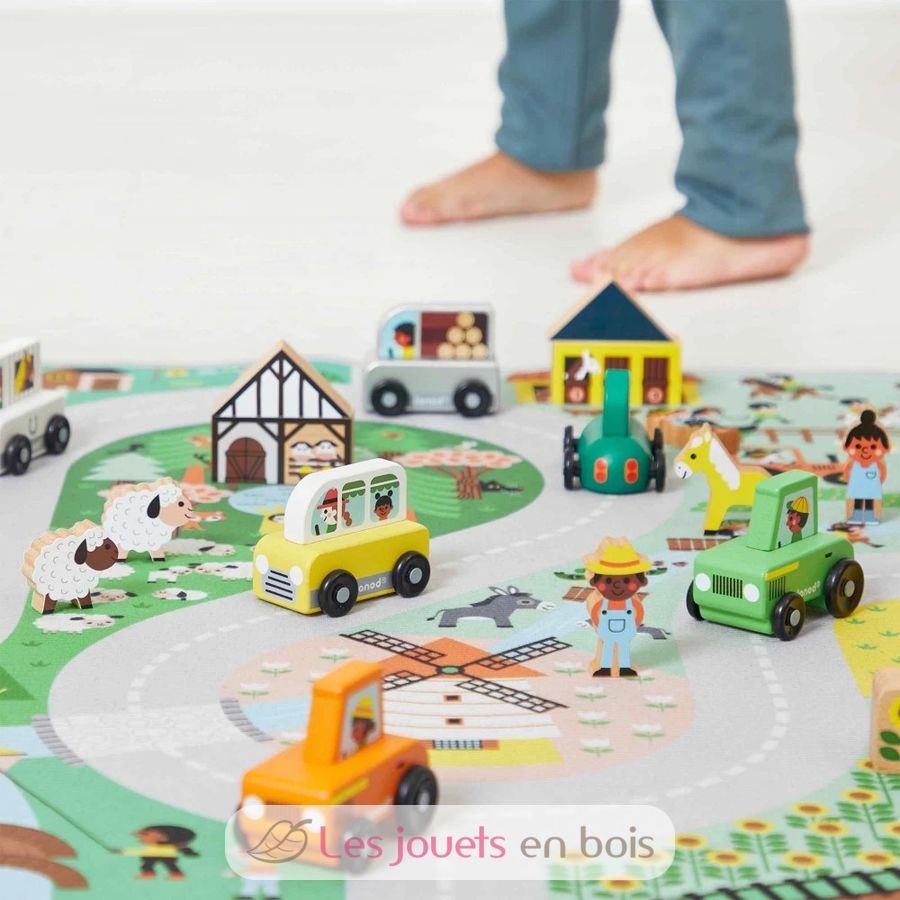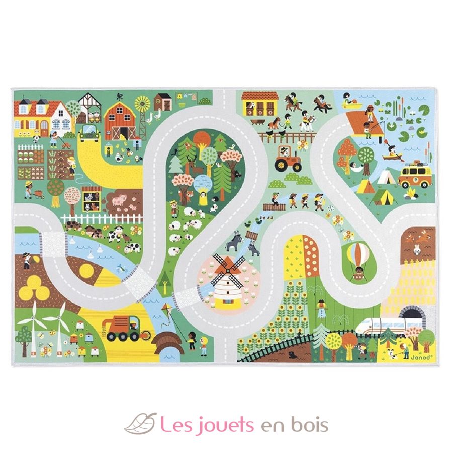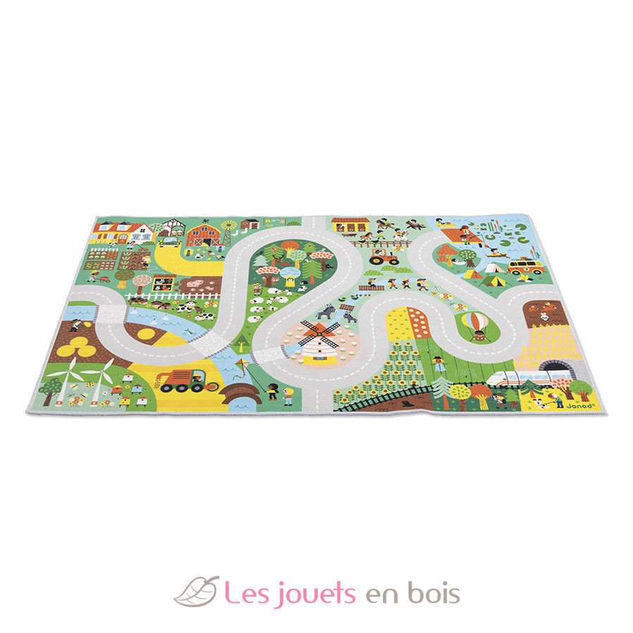 En su alfombra de juegos con circuito, los más pequeños podrán divertirse por los sinuosos caminos rurales buscando elementos ocultos, como en un juego de buscar y encontrar. Verán al lobo en el bosque, al granjero en su tractor, se divertirán con los patitos que cruzan el río... ¡Hay tantos edificios, animales y personajes representados! Empezaremos regando el huerto, luego iremos a ayudar al pastor a cuidar de sus ovejas, antes de dirigirnos al picadero para dar un paseo a caballo.