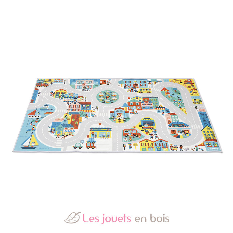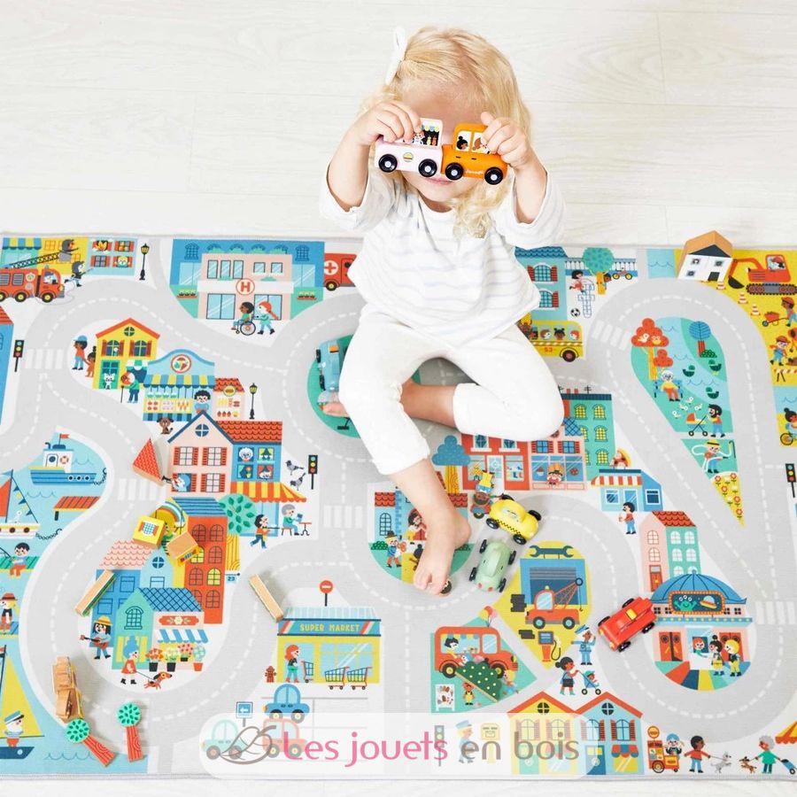 En su alfombra de juegos con circuito, los pequeños se divertirán cruzando cruces y rotondas en busca de objetos ocultos, como en un juego de buscar y encontrar. Podrán descubrir dónde está el cartero, los transeúntes que pasean a su perro o los recién casados en la explanada del ayuntamiento... ¡Hay tantos edificios, profesiones y vehículos representados! Una rápida parada en el supermercado para aprovisionarnos, y luego al parque a tomar un tentempié, antes de ir al cine para disfrutar de una divertida proyección en familia.