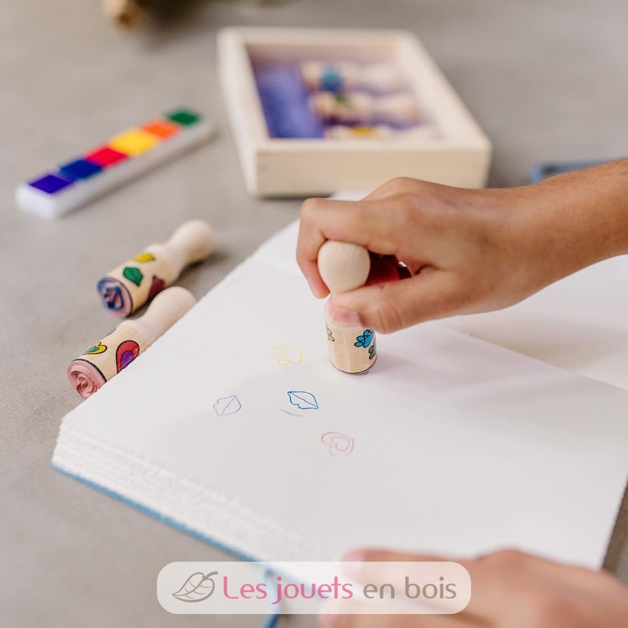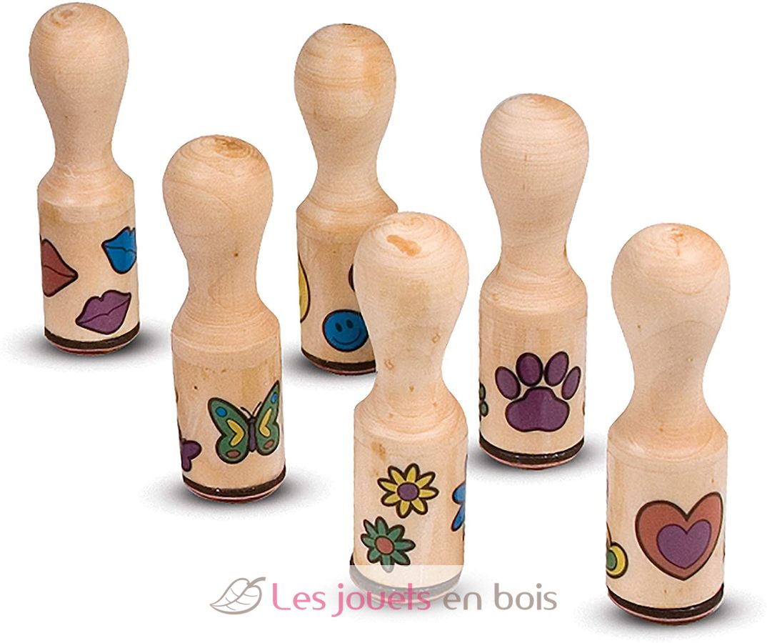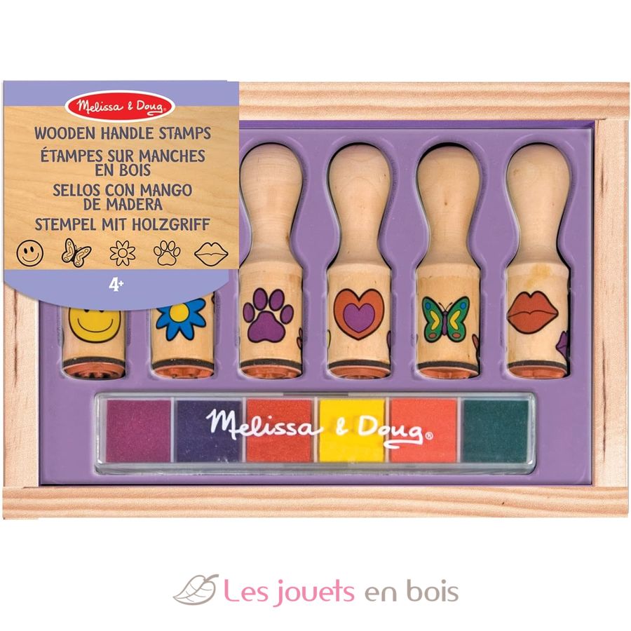 Con alegres ilustraciones y asas de fácil agarre, este set de 6 sellos de goma es perfecto para los niños de preescolar. El mango de madera extra largo mantiene los dedos de los niños en la almohadilla de tinta. El juego se presenta en una robusta caja de madera e incluye una almohadilla de tinta de seis colores. 7 piezas Tintas lavables a máquina ;-) Para un niño de más de 3 años. Un juguete de la famosa marca americana Melissa and Doug. Ref : 12407