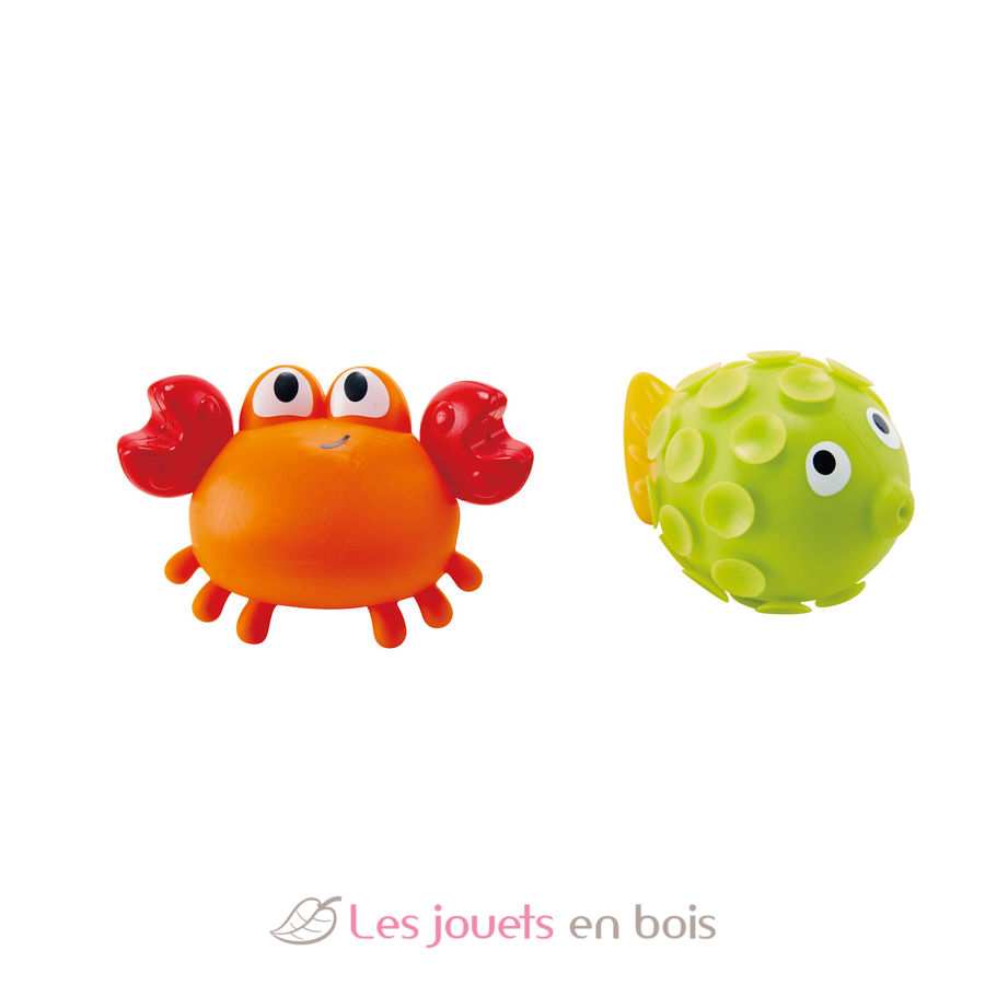 Un divertido juguete de baño formado por un cangrejo y un pez para entretener al bebé en el baño.