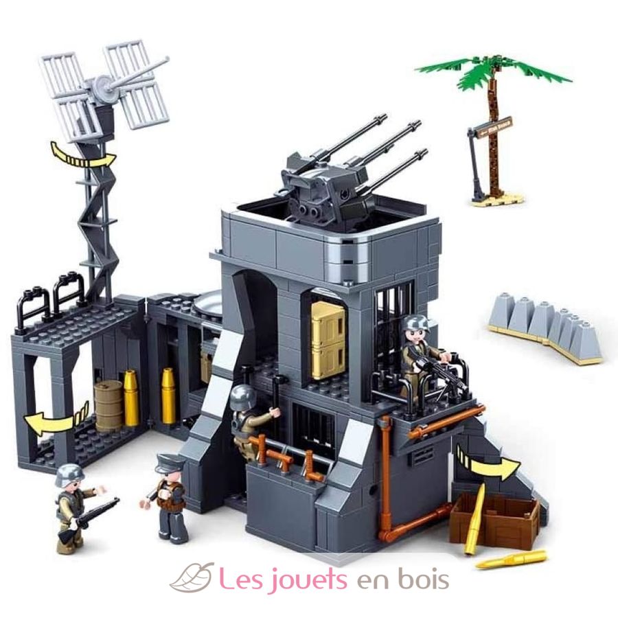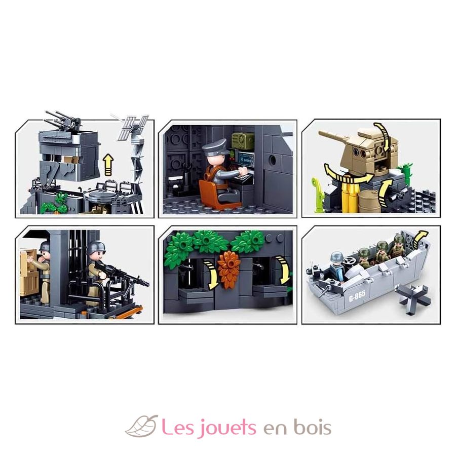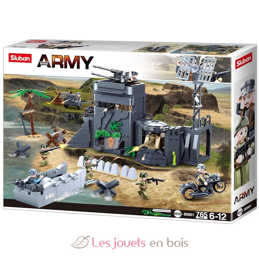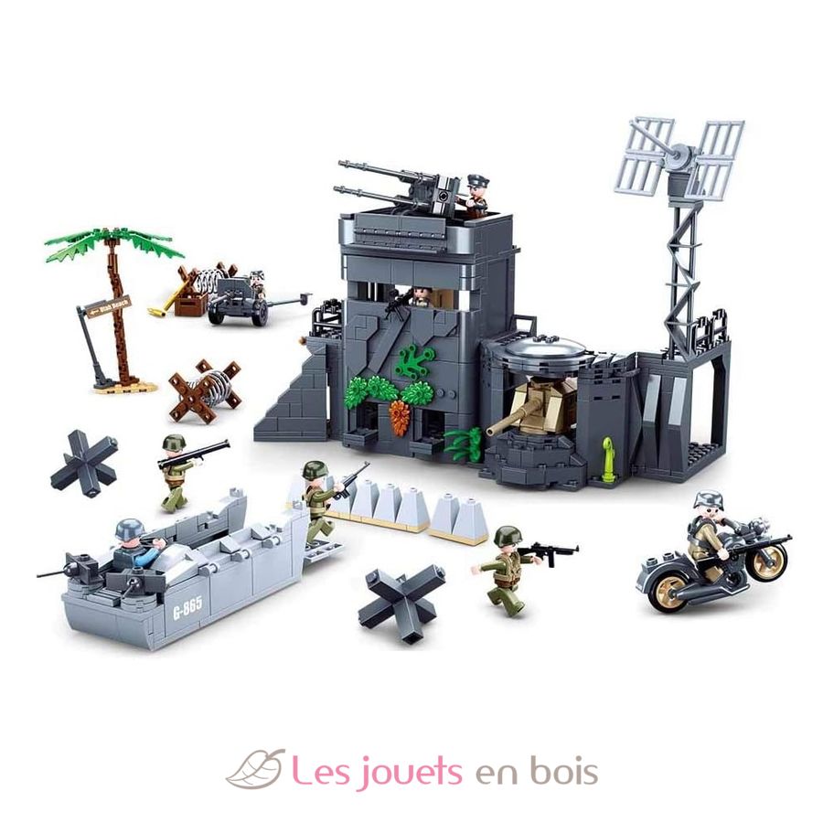 Recrea la escena del Muro Atlántico, construido para impedir el desembarco aliado durante la Segunda Guerra Mundial. Este kit de construcción de Sluban contiene 765 piezas, incluyendo 8 figuras, una lancha de desembarco, una base armada (o búnker), una ametralladora móvil y elementos decorativos.