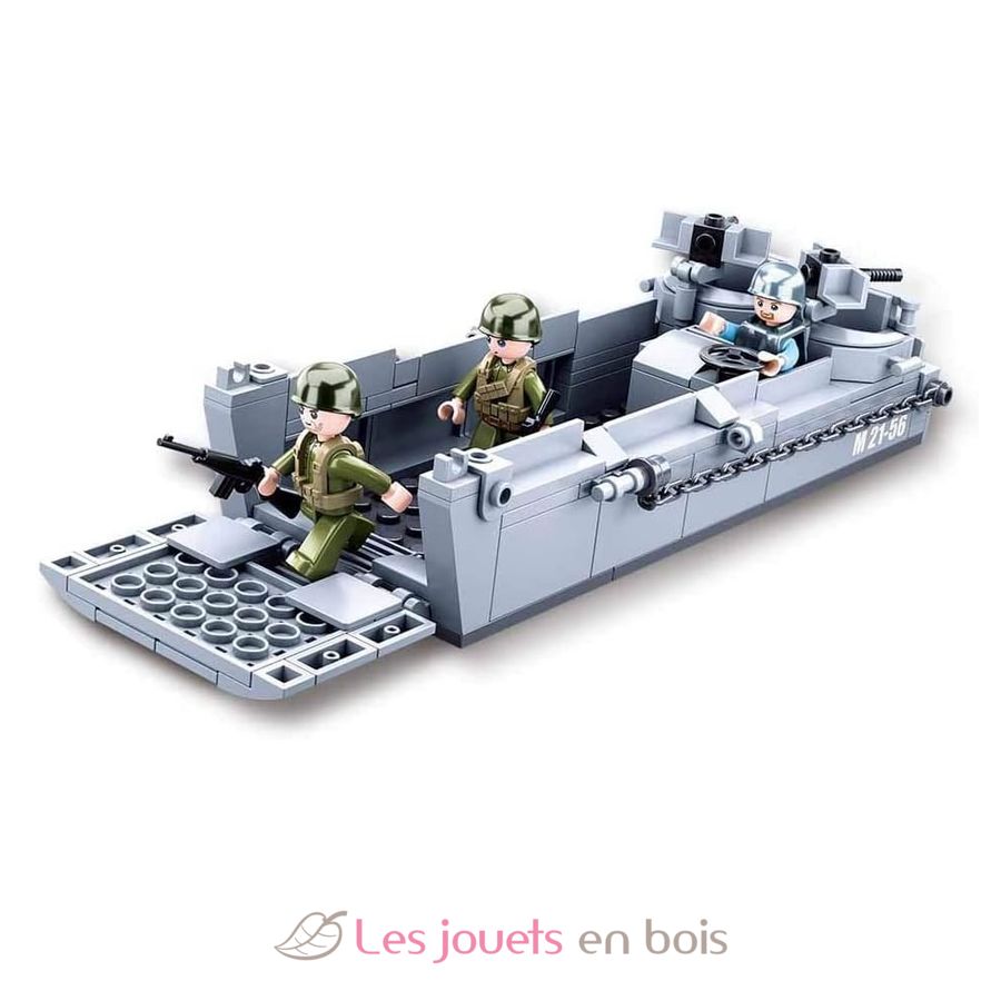 Esta lancha de desembarco fue utilizada por las tropas aliadas que desembarcaron en las playas de Normandía el 6 de junio de 1944, durante la Segunda Guerra Mundial. Este kit de construcción de Sluban contiene 182 piezas, incluyendo 3 figuras.