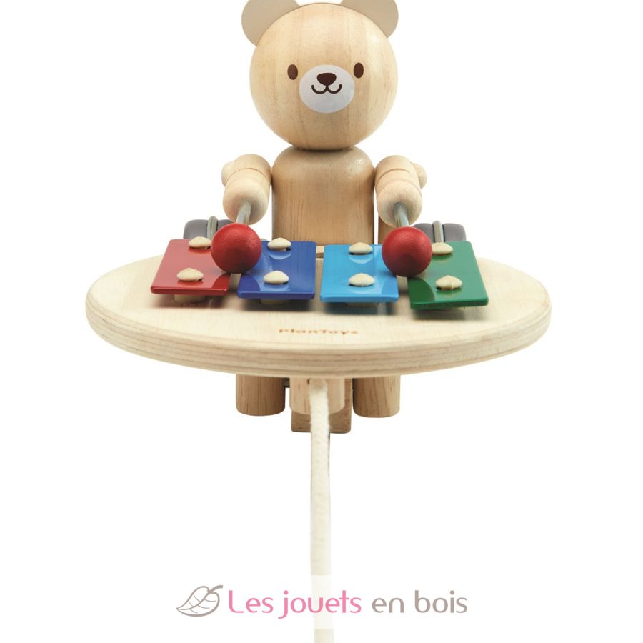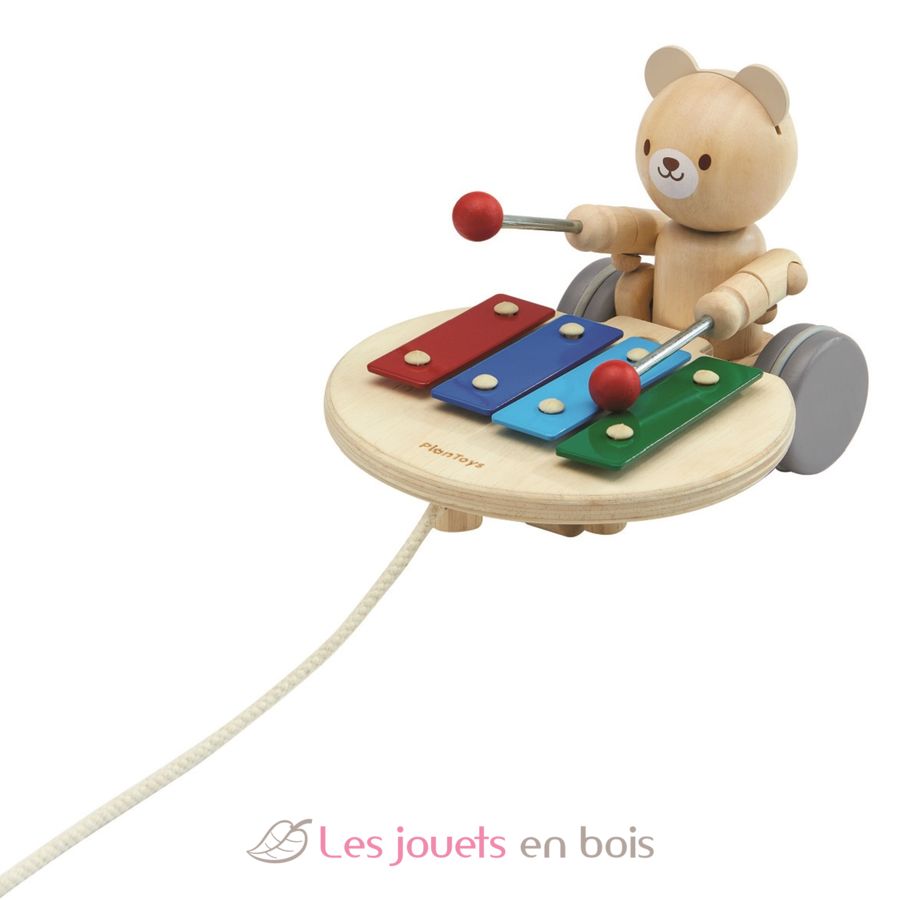 Descubre este simpático osito de madera que toca el xilófono, ¡a tu hijo le encantará tirar de él y escucharlo tocar música!