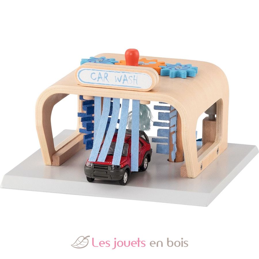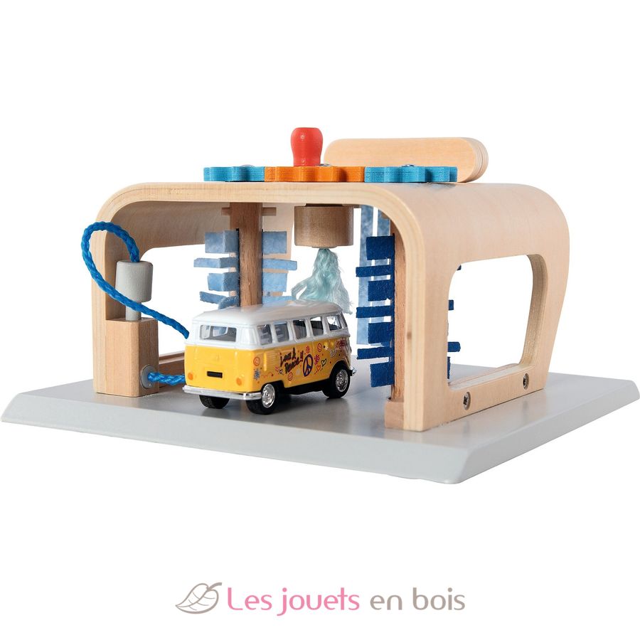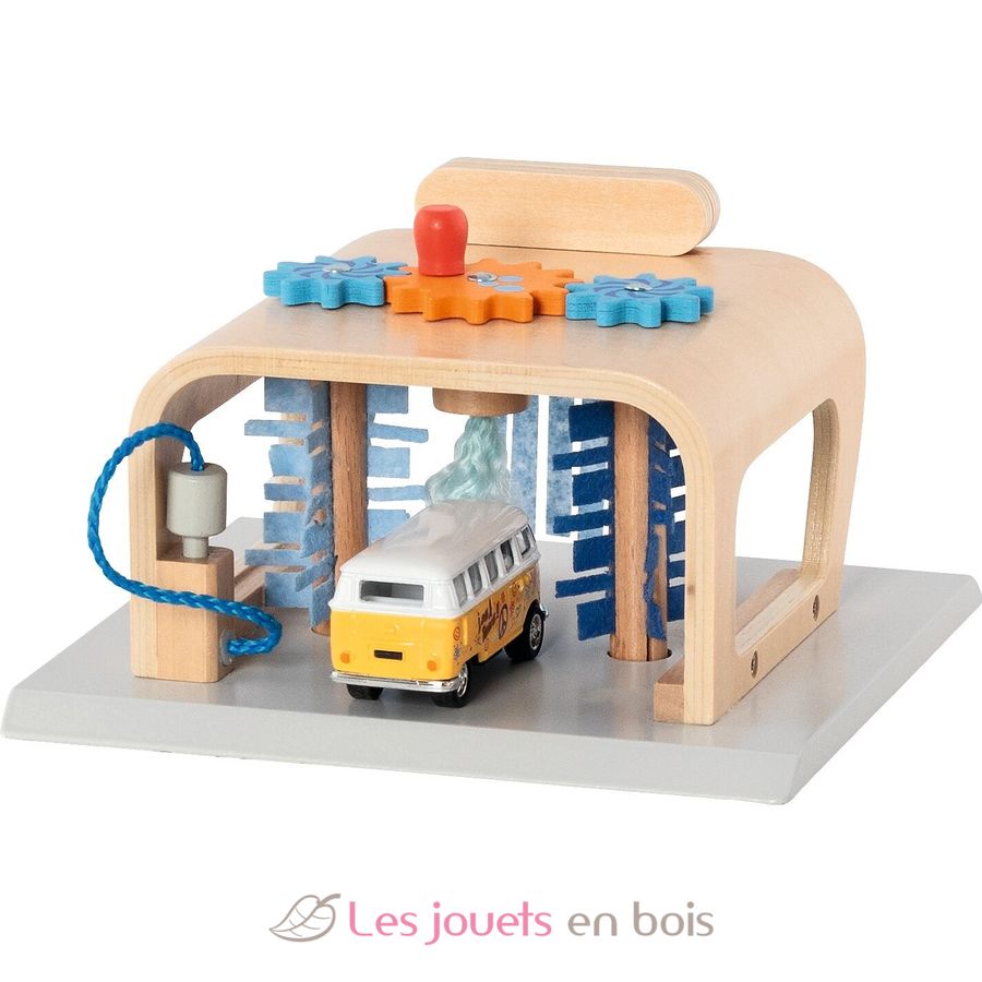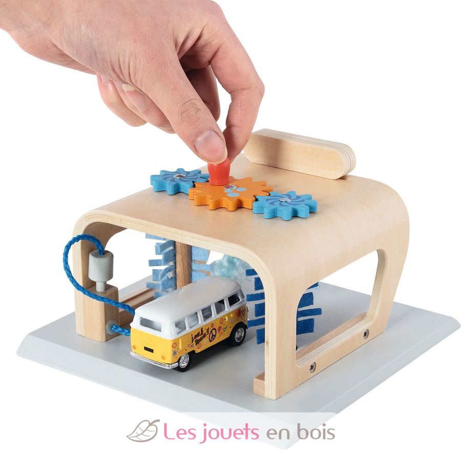 Y lo mejor de este garaje de madera: basta con girar los engranajes del techo para que los cepillos se pongan en movimiento.