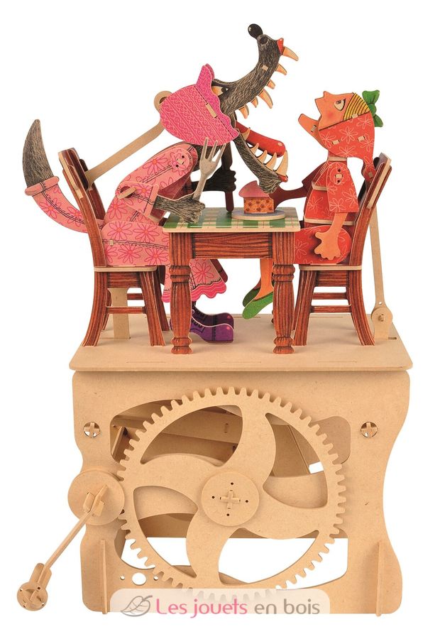 ¡Un autómata de madera para montar, sin pegamento ni herramientas, y que cobra vida al girar la manivela! Una hermosa pieza para armar uno mismo, sutil y compleja a la vez.
