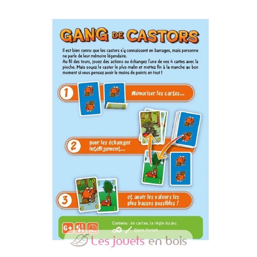 Memoria, faroles y trucos! El objetivo en Beaver Gang es reunir el menor número de puntos posible. Los jugadores ponen 4 cartas boca abajo frente a ellos, sólo se les revelarán 2 de ellas. En cada turno, tienes la opción de jugar cartas de acción O cambiar tus cartas por las del mazo o la pila de descartes. Ten cuidado y memoriza el valor de tus cartas si quieres hacer buenos intercambios y acumular el menor número de puntos posible. La memoria, los faroles y los trucos forman parte de este juego reservado a los castores más astutos.