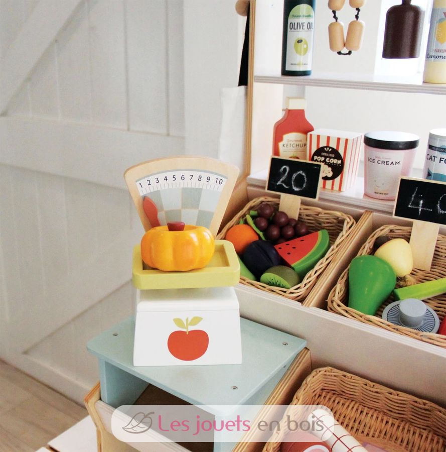 Esta báscula de estilo retro es el accesorio perfecto para jugar a las compras. Coloque la fruta y la verdura en la bandeja y el puntero de madera se moverá para indicar el peso. Esta hermosa balanza de madera es el complemento perfecto para un juego de comedor o un puesto de comerciante.