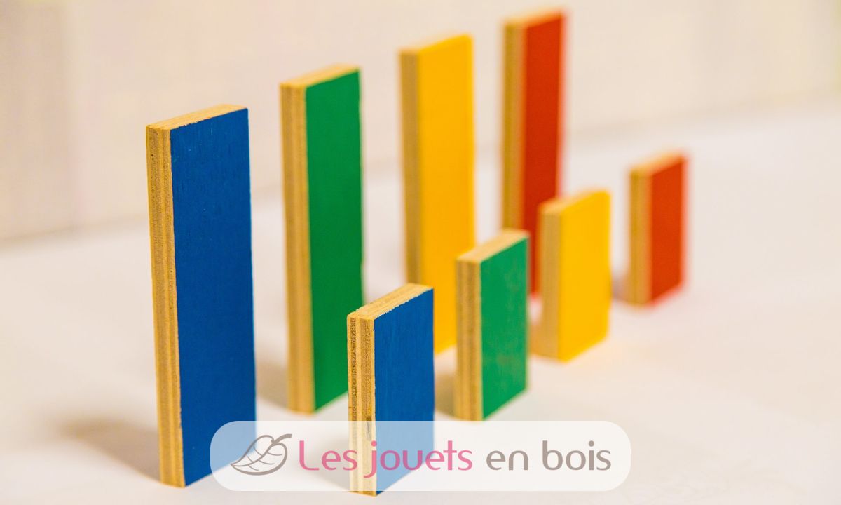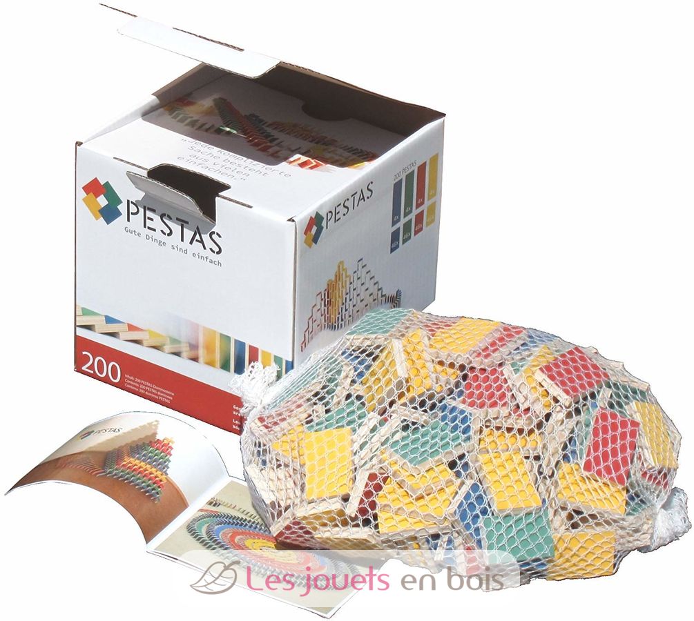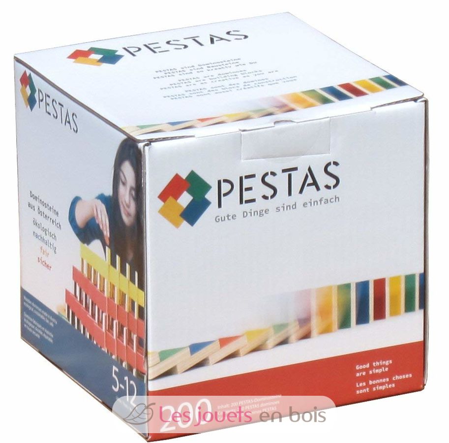 Esta caja contiene 200 fichas de dominó Pestas en rojo, azul, verde y amarillo para pasar horas construyendo circuitos y cascadas de dominó!