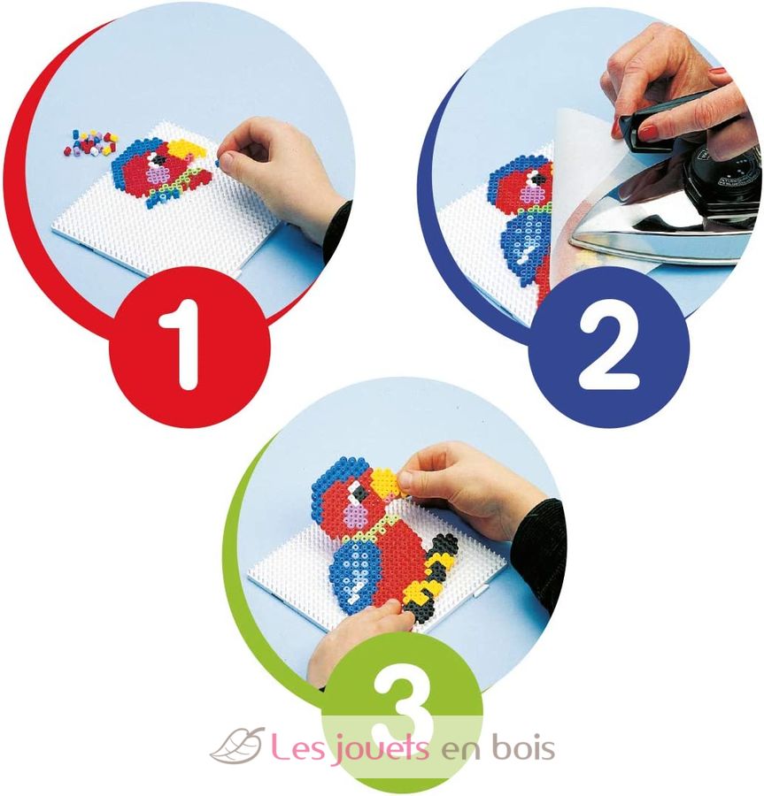 Para utilizarlas como perlas para planchar, simplemente elija un plato, coloque las perlas sobre él y luego fíjelas con la plancha (este paso siempre debe ser realizado por un adulto). Las cuentas Hama también se pueden coser juntas para crear patrones originales.
