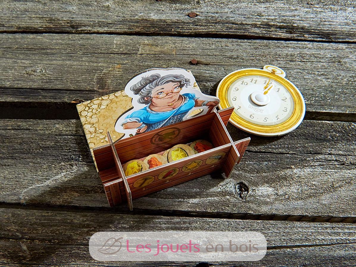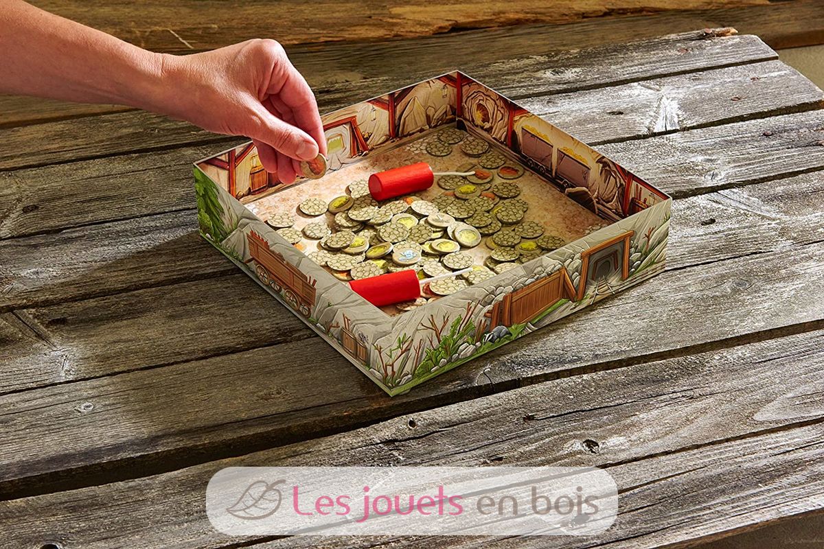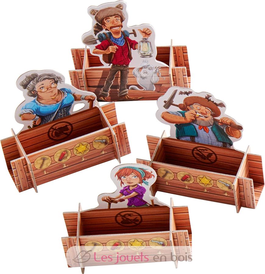Contenido: 1 mina de oro (parte inferior de la caja con 2 inserciones), 4 personajes con cofre, 4 cartuchos de dinamita, 4 depósitos, 1 reloj (= cuentavueltas), 160 fichas : 82 piedras, 35 pepitas de oro legales, 35 pepitas de oro ilegales, 4 fichas especiales (1 murciélago, 1 serpiente, 1 rata, 1 fantasma), 4 fichas de acción (1 pico, 1 dinamita, 1 revólver, 1 estrella de sheriff), 1 regla de juego.