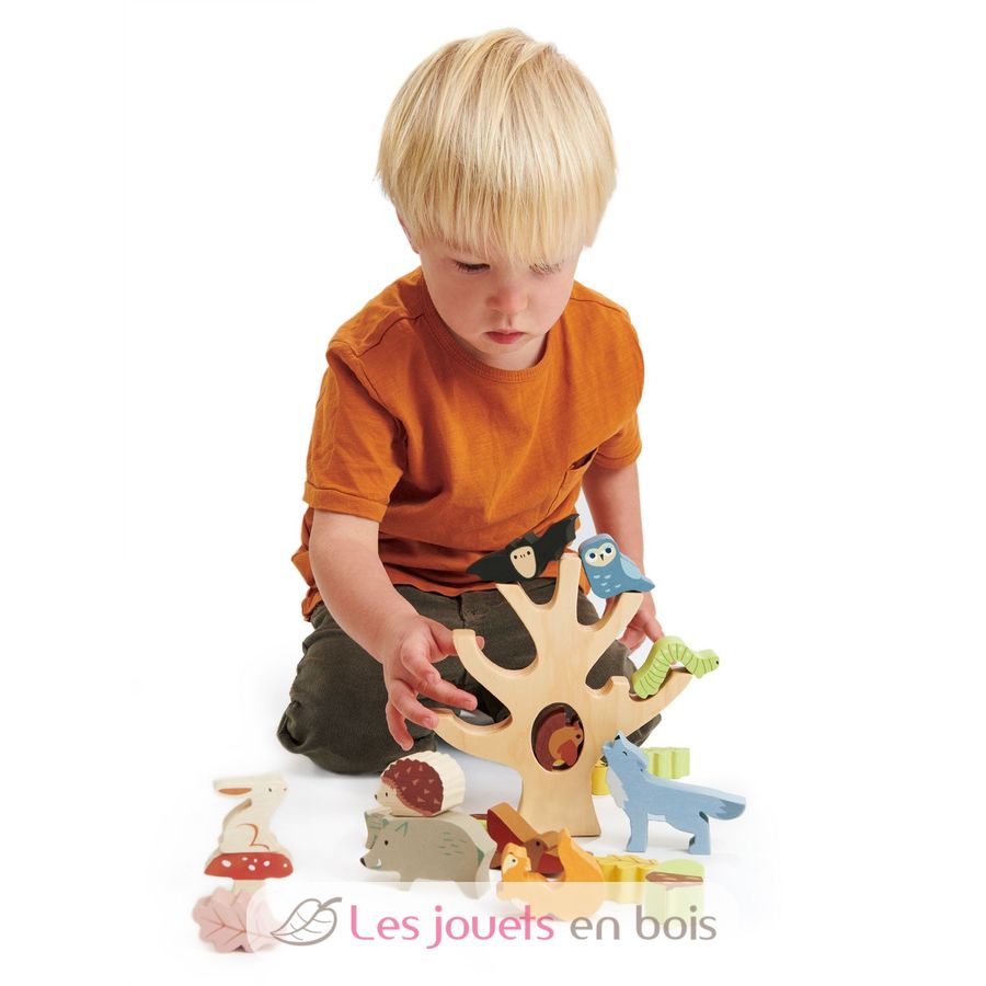 Un árbol de madera apilable con 19 coloridos animales y elementos de la naturaleza, incluyendo un búho, un murciélago, un lobo, una ardilla, un pájaro carpintero, una bellota, un jabalí y un bebé, una oruga, cinco hojas, una seta, un conejo, un erizo, un pájaro y un pájaro en un nido.