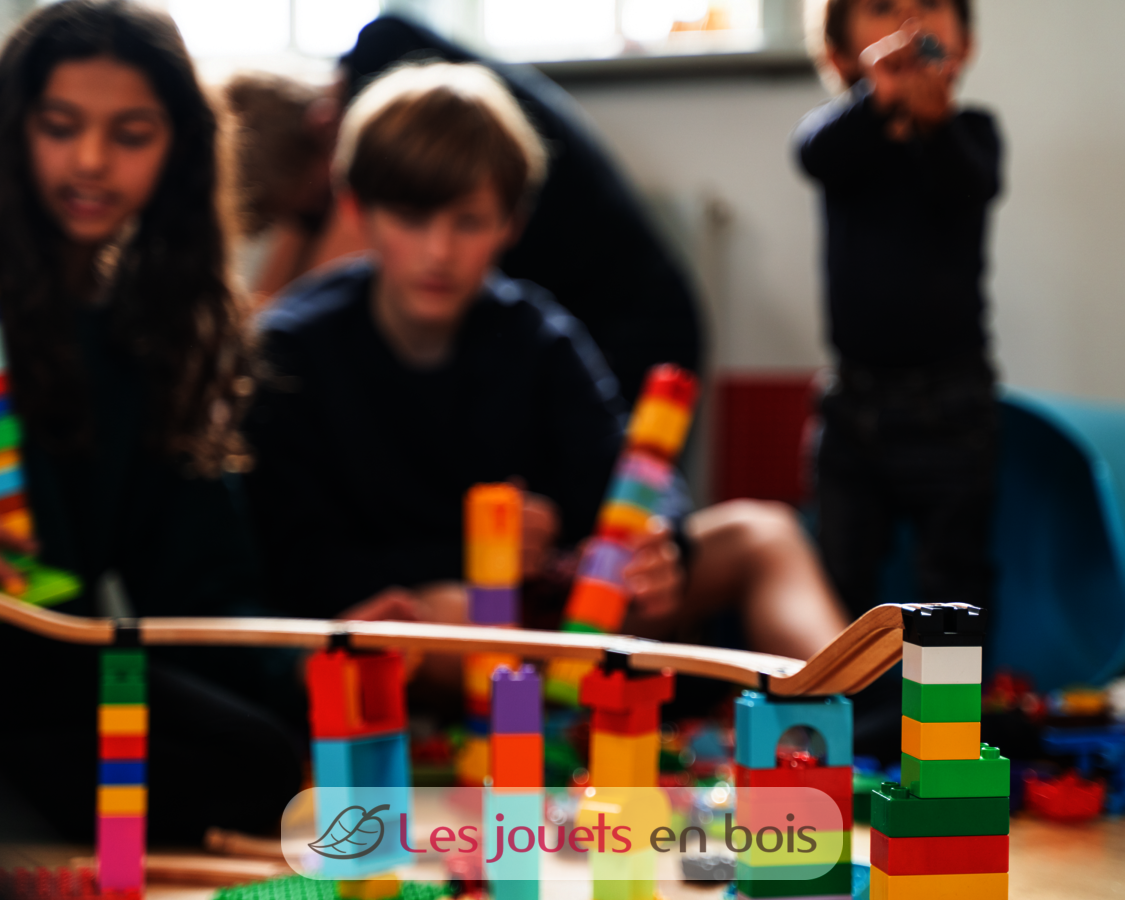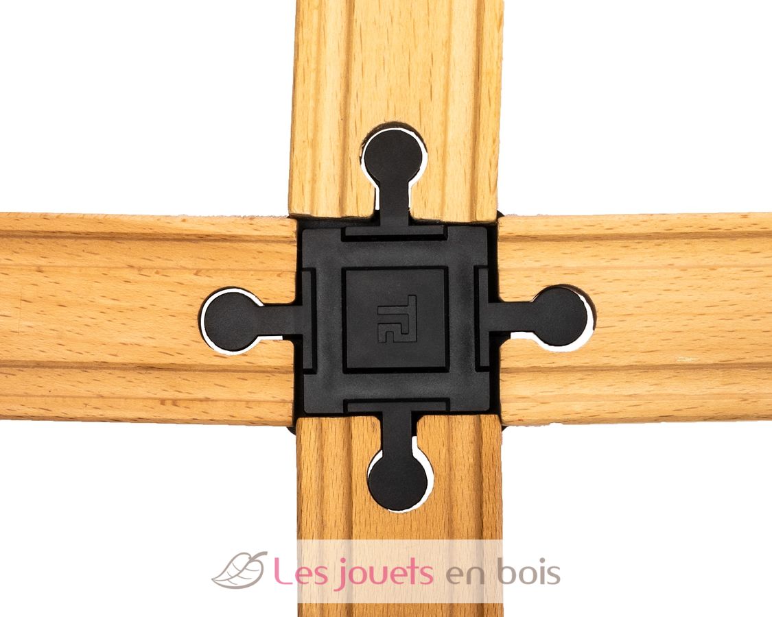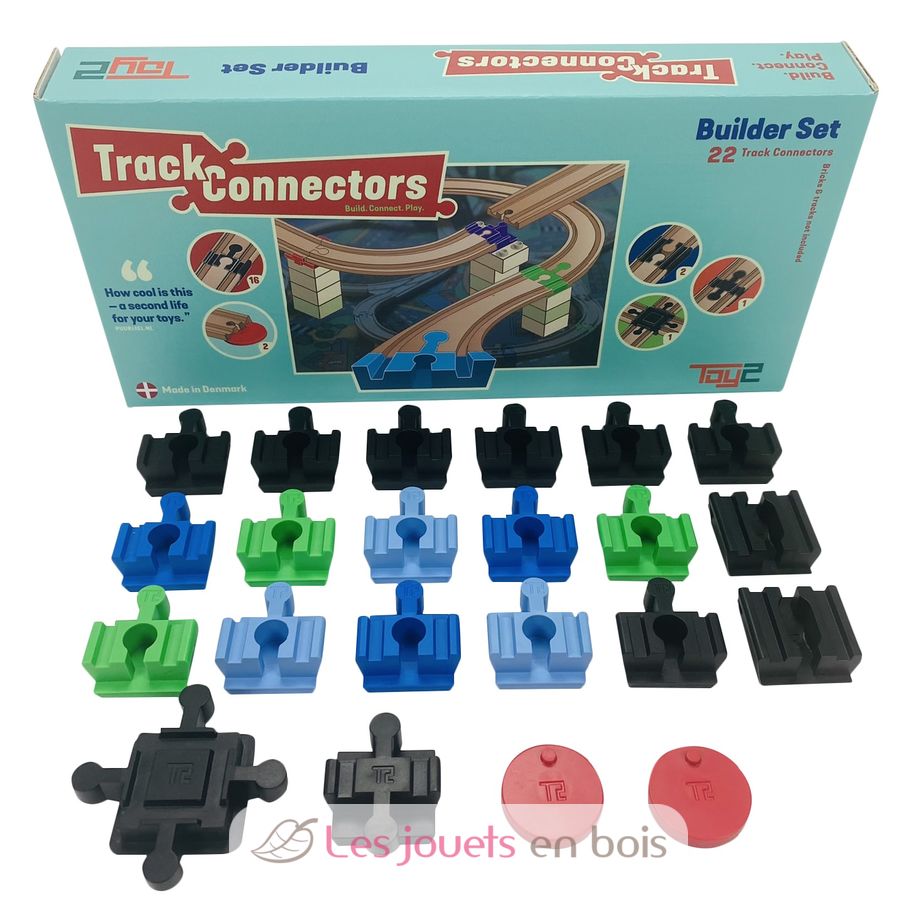 El Builder Set contiene 22 conectores de vía de plástico para conectar sus ladrillos y sus vías de tren de madera: 16 conectores de base, 1 conector de doble lengüeta, 2 conectores de doble ciego, 2 conectores de anclaje y 1 conector de intersección.