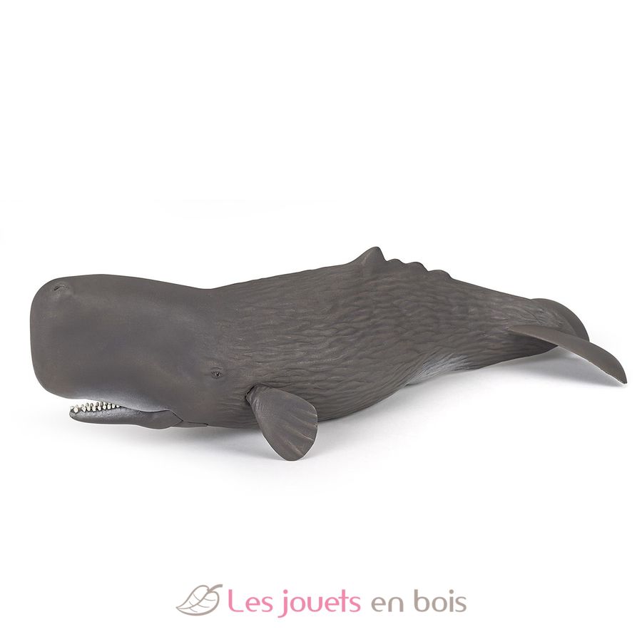 El cachalote es uno de los animales más grandes del mundo. Presente en los océanos y mares del mundo, este mamífero cetáceo mide una media de unos quince metros. Se alimenta principalmente de calamares, pero también de peces. Sólo la mandíbula tiene dientes (de 18 a 29 pares). Los dientes no erupcionan hasta los diez años. Puede sumergirse hasta 1000 m por debajo de la superficie y permanecer durante 1 hora sin respirar. El cachalote, una hermosa estatuilla sobre el tema de los animales acuáticos, cuidadosamente pintada a mano y modelada de forma muy realista. Las figuritas de Papo se convertirán rápidamente en la base de una colección que se enriquecerá progresivamente para el despertar y el descubrimiento de su hijo.