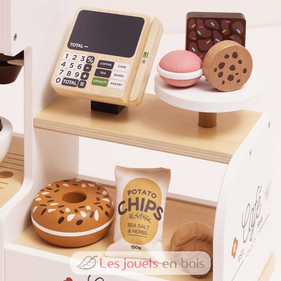 Este set de juego incluye una cafetera profesional, una caja registradora para tomar pedidos, una tarjeta de fidelización y todo lo necesario para servir deliciosas bebidas (hervidor, taza, cuchara, azúcar y leche). Este puesto también incluye delicias para disfrutar: croissants, donuts, galletas, macarons, brownies y patatas fritas, además de bolsitas de té.