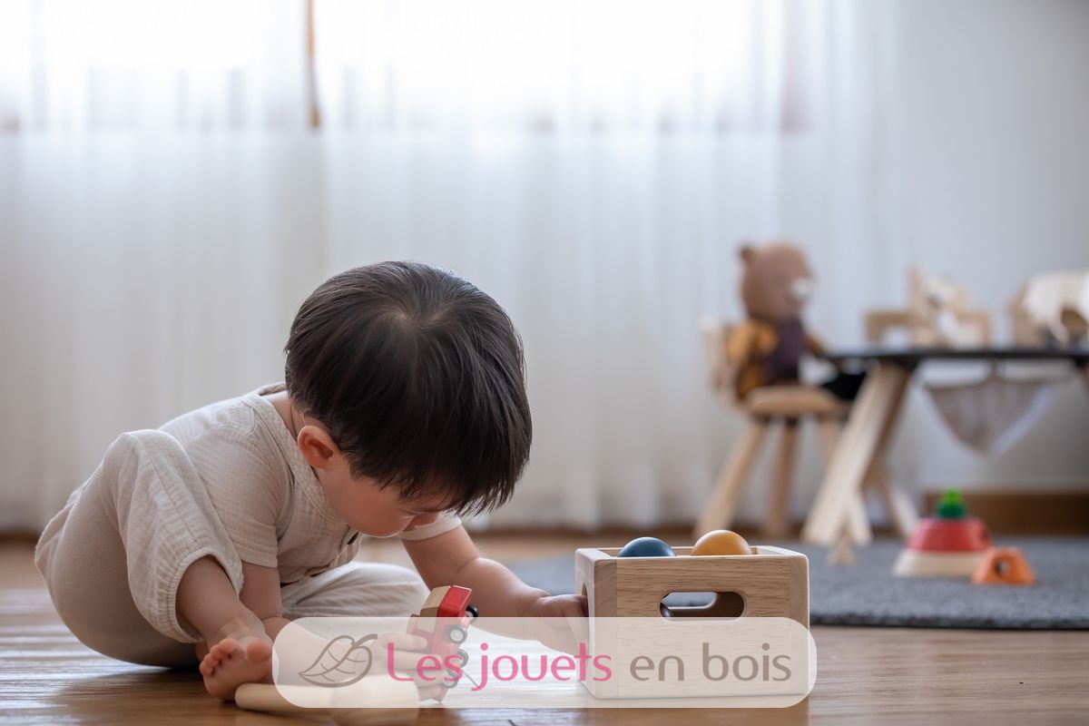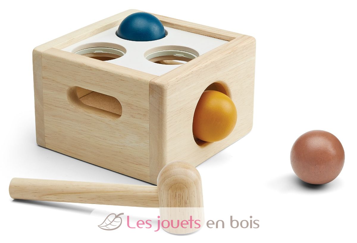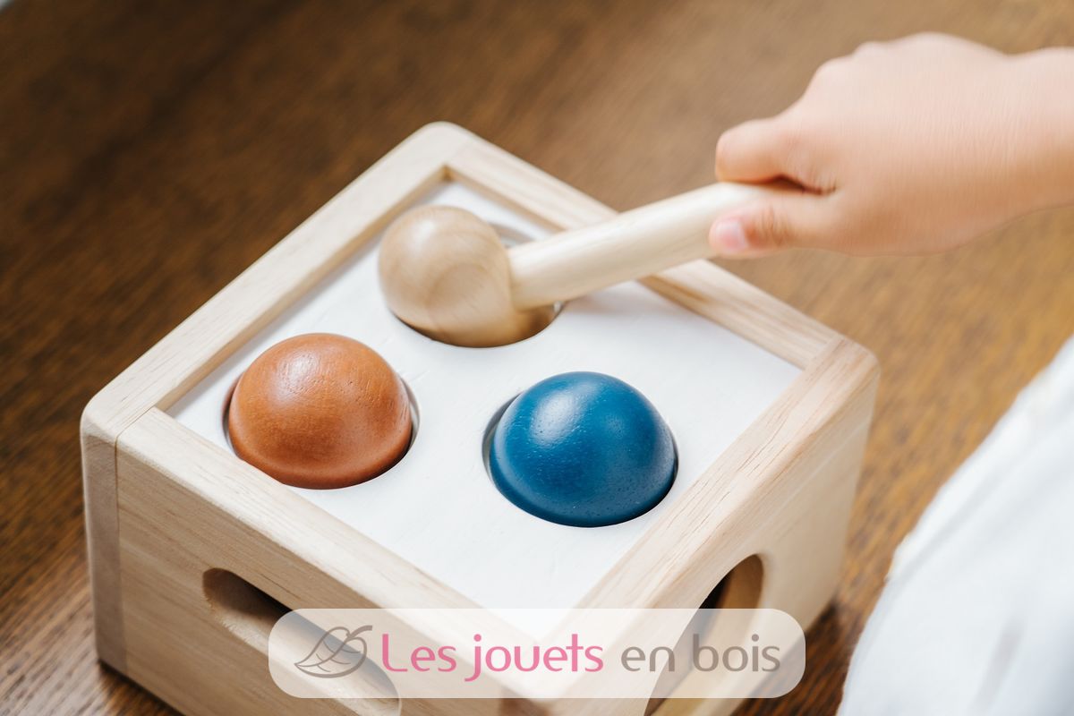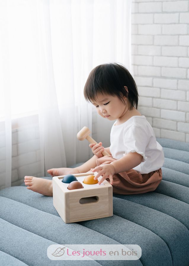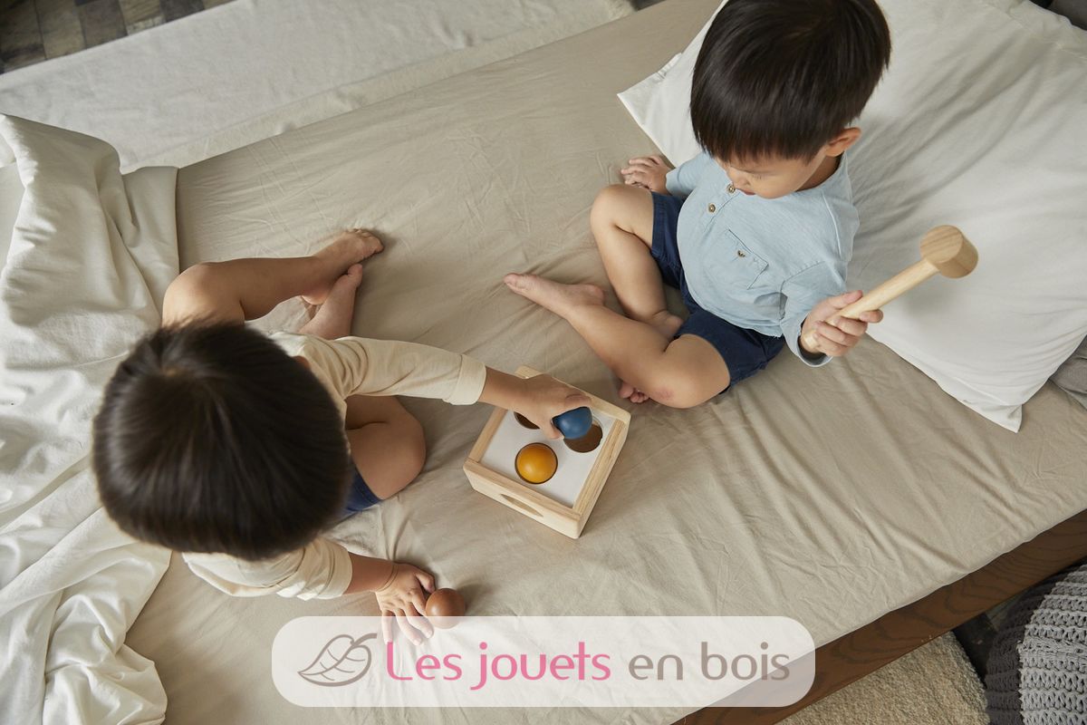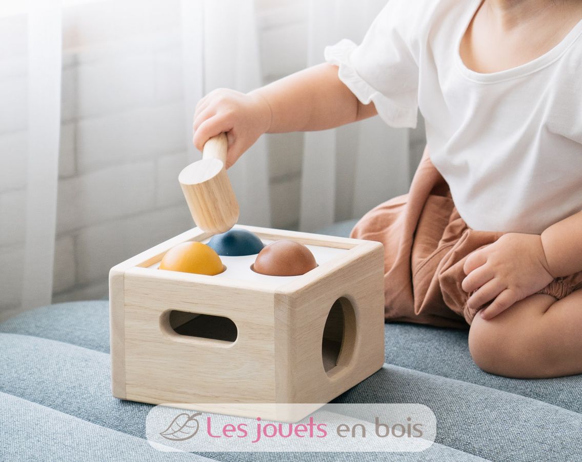 Caja de 3 bolas Tenderness Colours, un juguete de madera para martillar de la marca Plan Toys. Referencia PT5472.