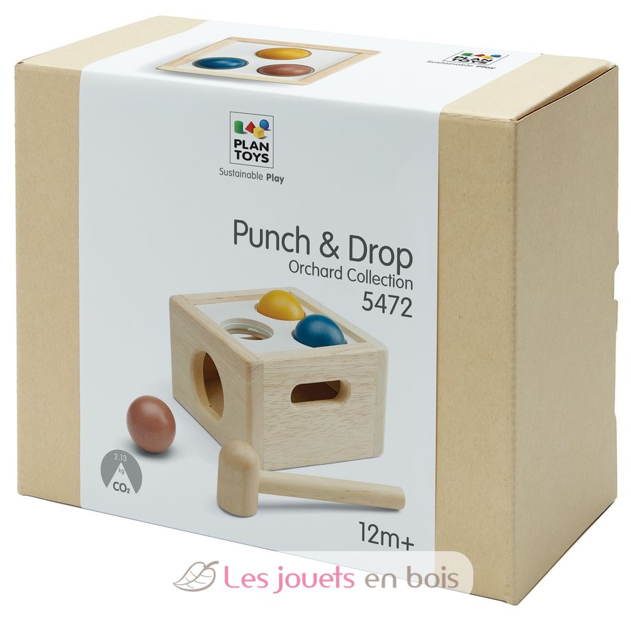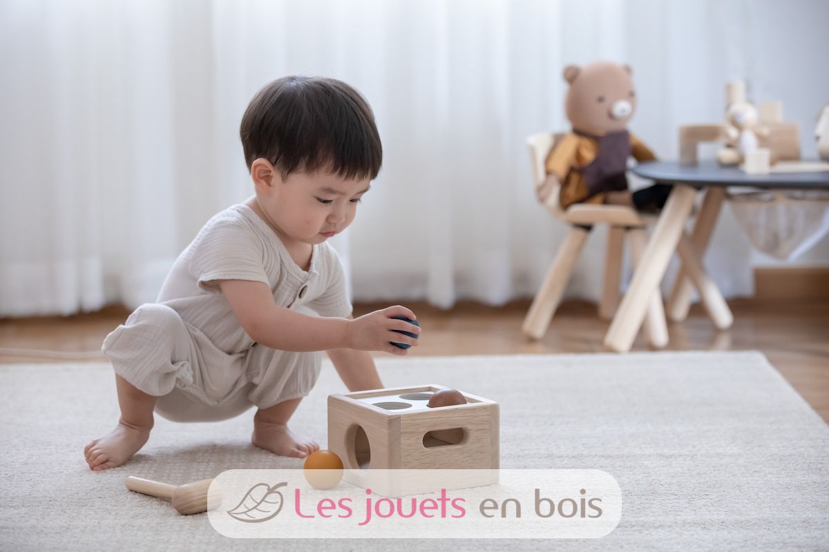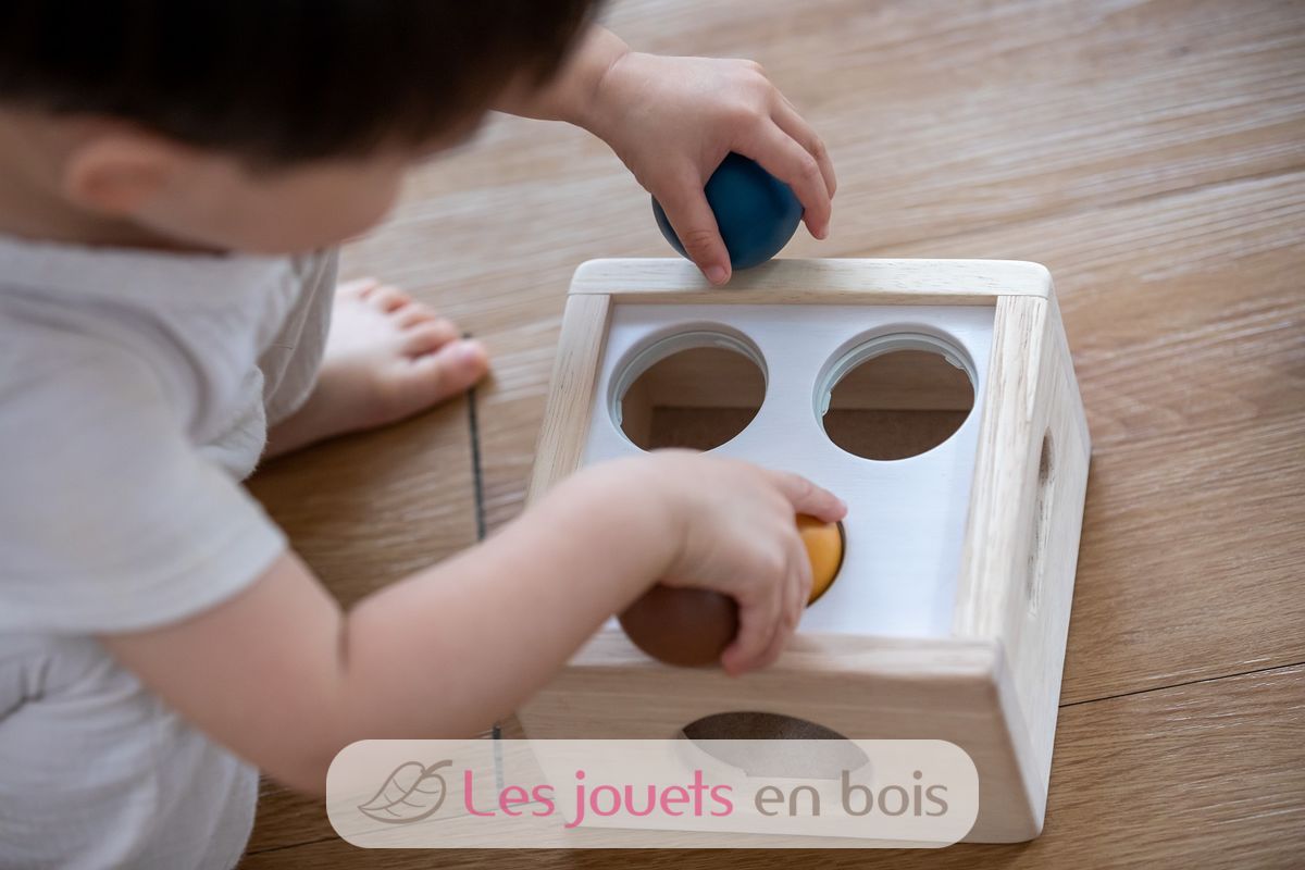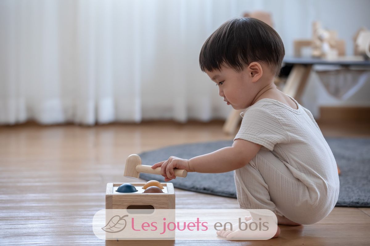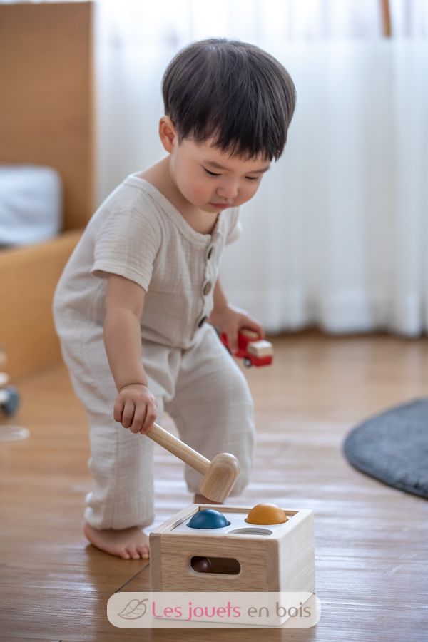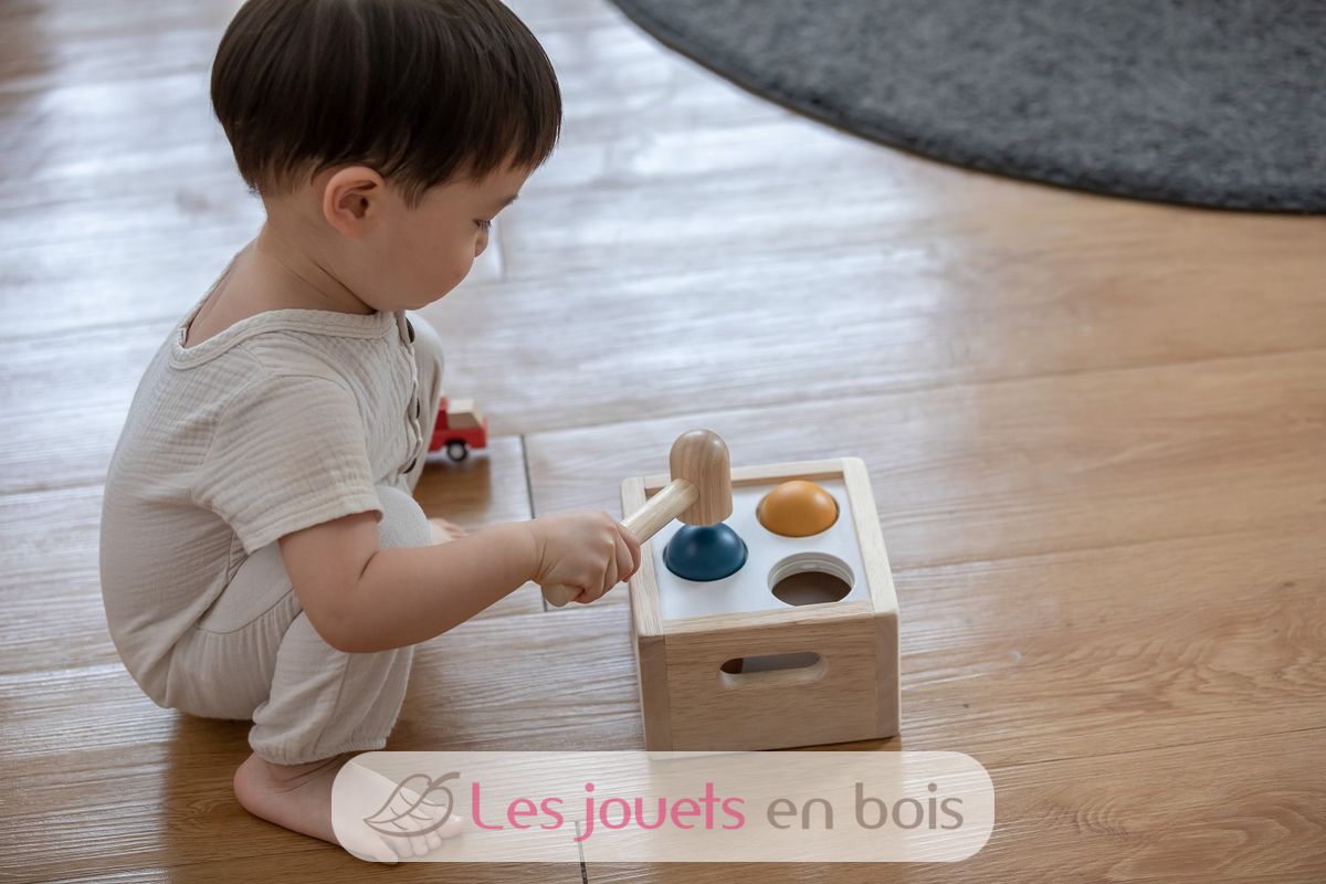 Caja de 3 bolas Tenderness Colours, un juguete de madera para martillar de la marca Plan Toys. Referencia PT5472.