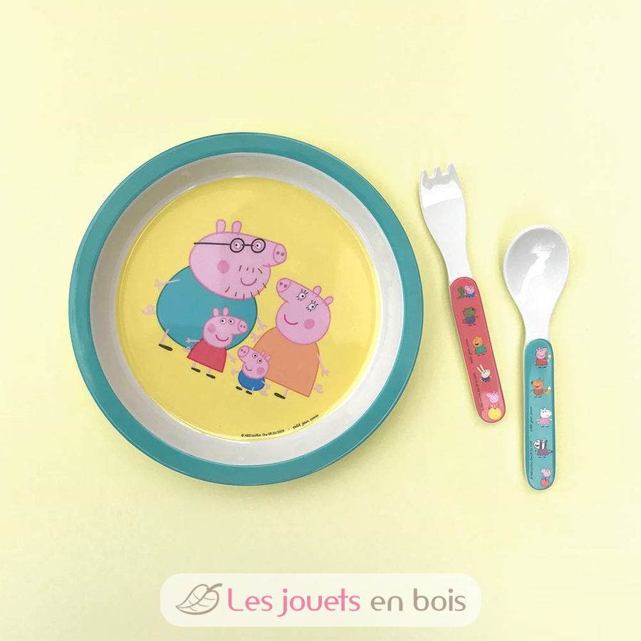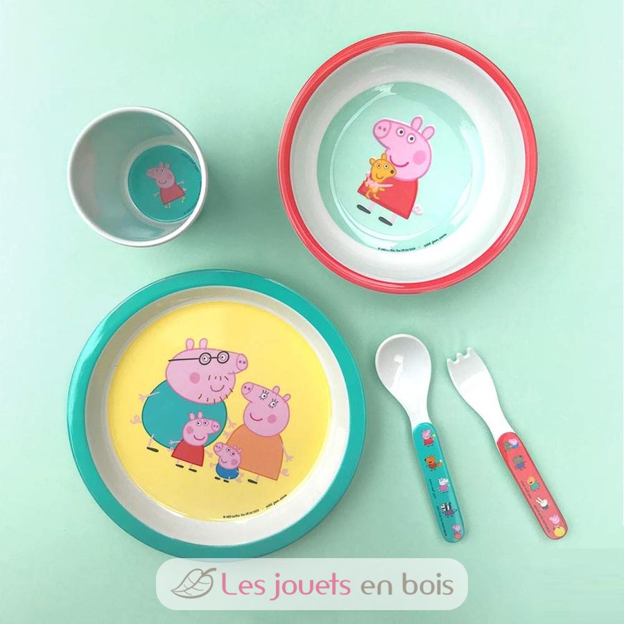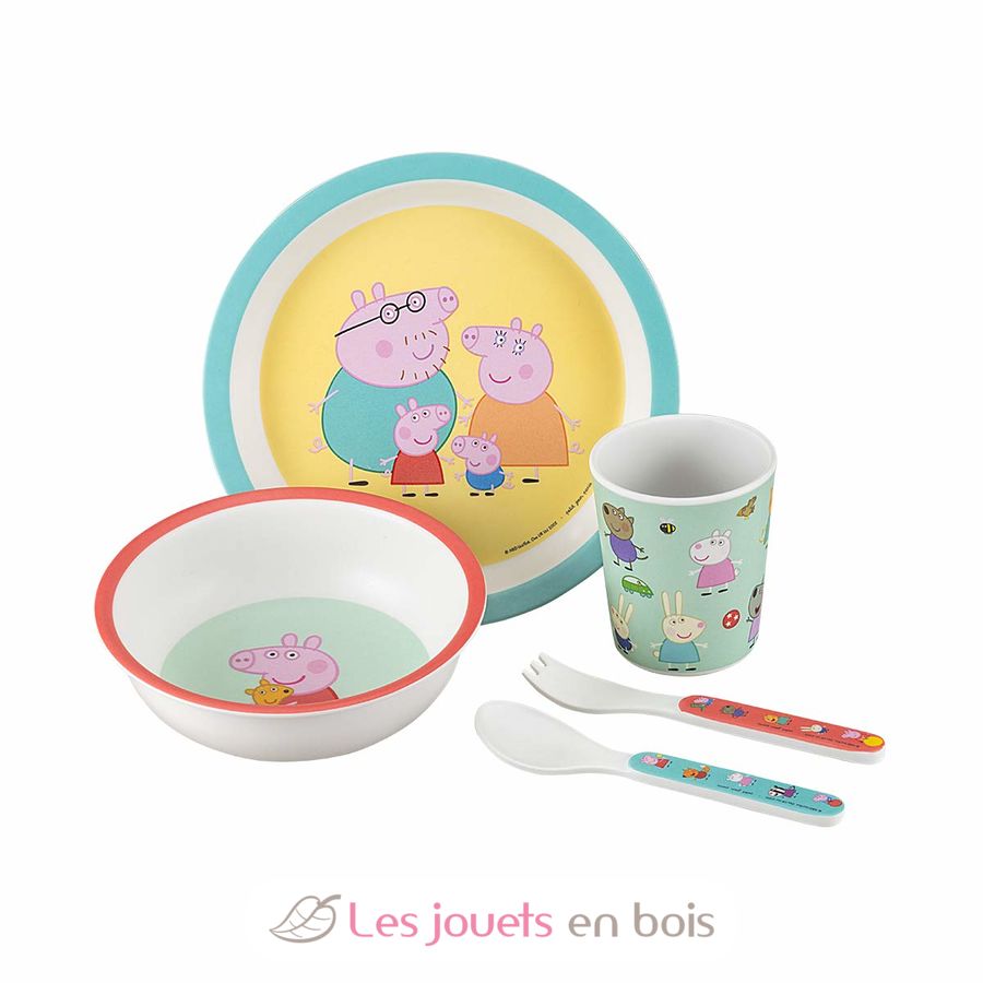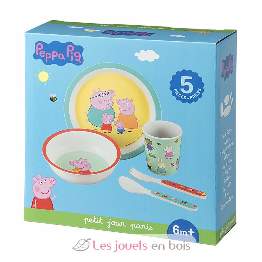 Un bonito juego de 5 piezas con bordes ergonómicos para ayudar al niño a coger la comida y a aprender a comer solo. Un plato, un bol, un vaso y un set de 2 cubiertos.