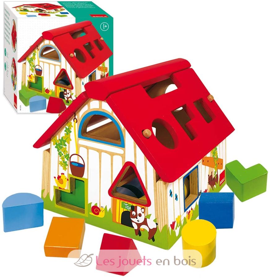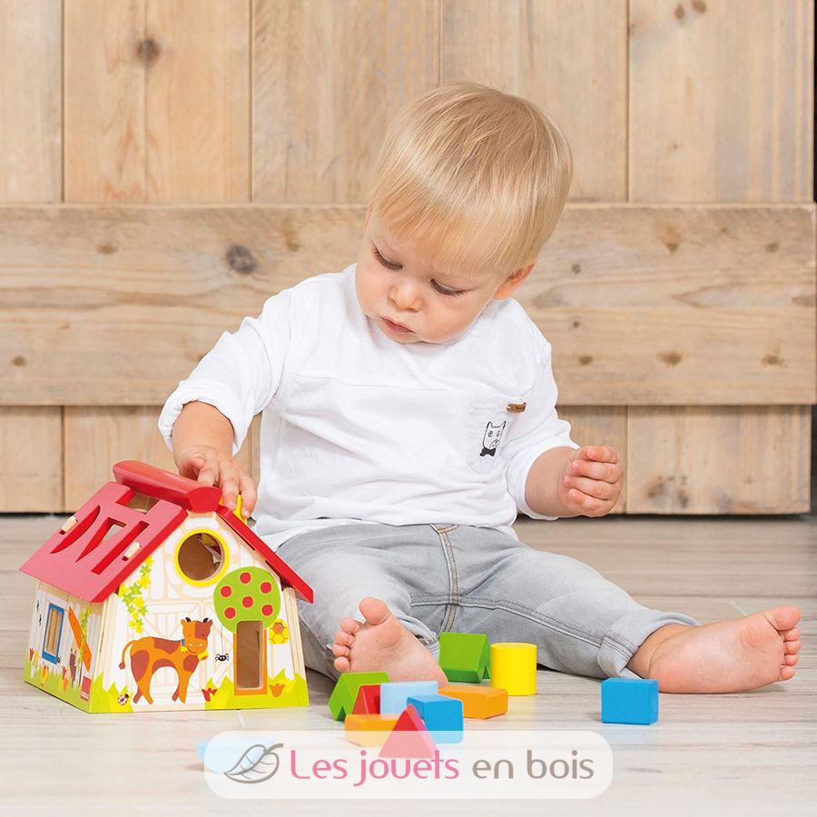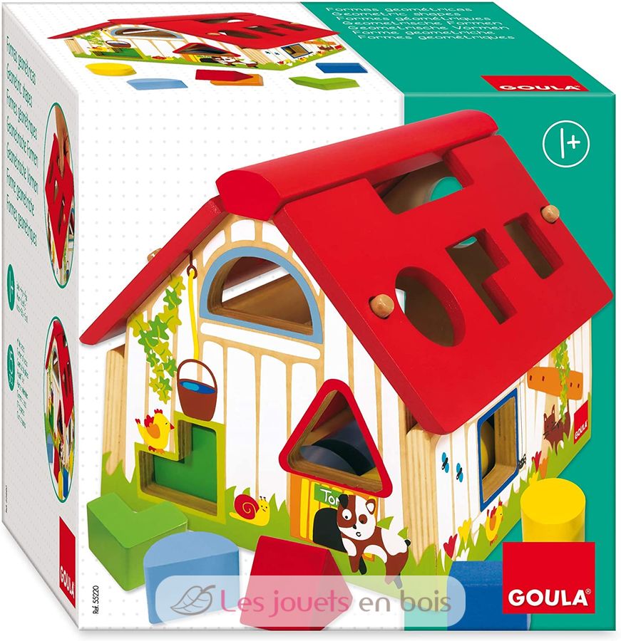 Granja con formas geométricas para insertar en madera. La granja es un tema muy popular entre los más pequeños. A los niños les encantará esta colorida caja de formas. Un juguete de madera de la empresa Goula. Ref 55220.