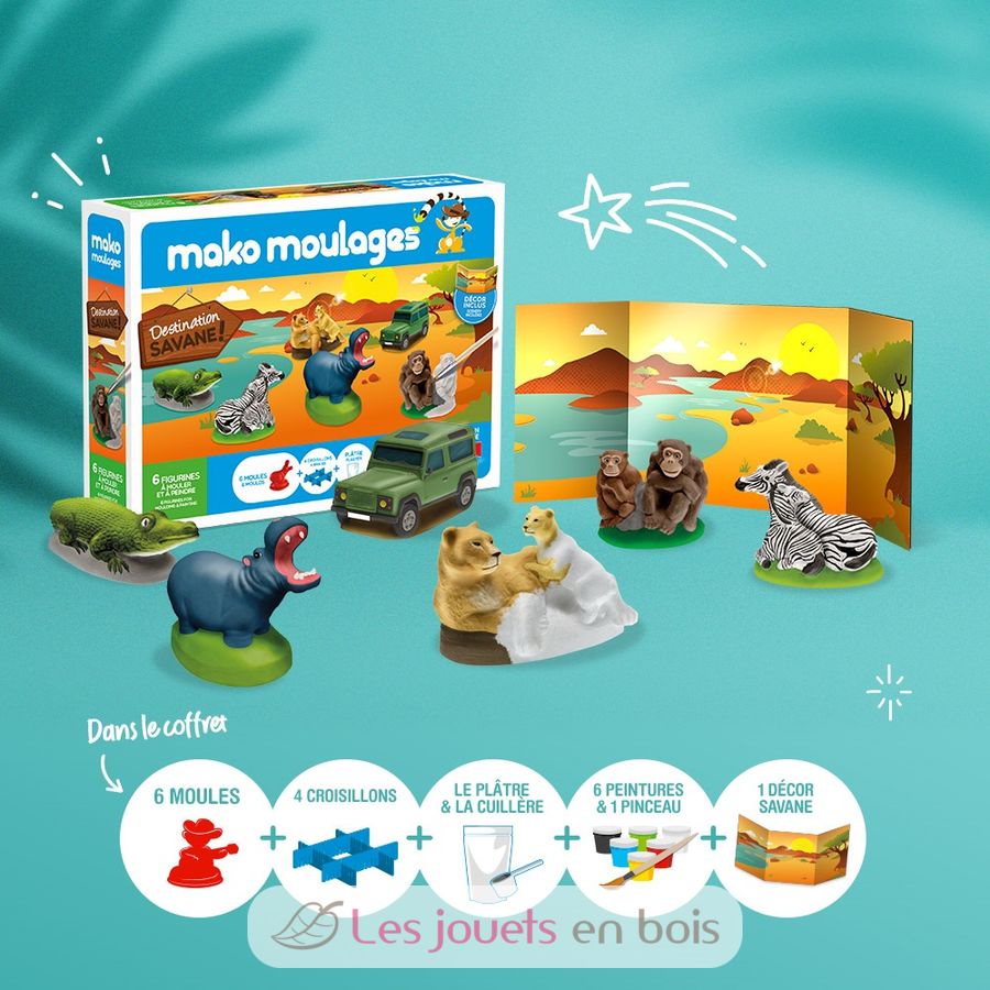Con este kit creativo de Mako Moulages, diviértete moldeando y pintando 5 animales de la sabana (la leona y su cachorro, el hipopótamo, la cebra y su cachorro, el cocodrilo, el mono y su cachorro) y un 4x4 aterriza para descubrirlos en un safari . ¡Organiza tu decoración y deja que tu imaginación dé vida a tus creaciones!