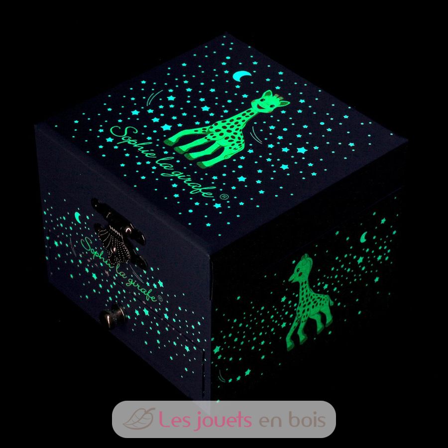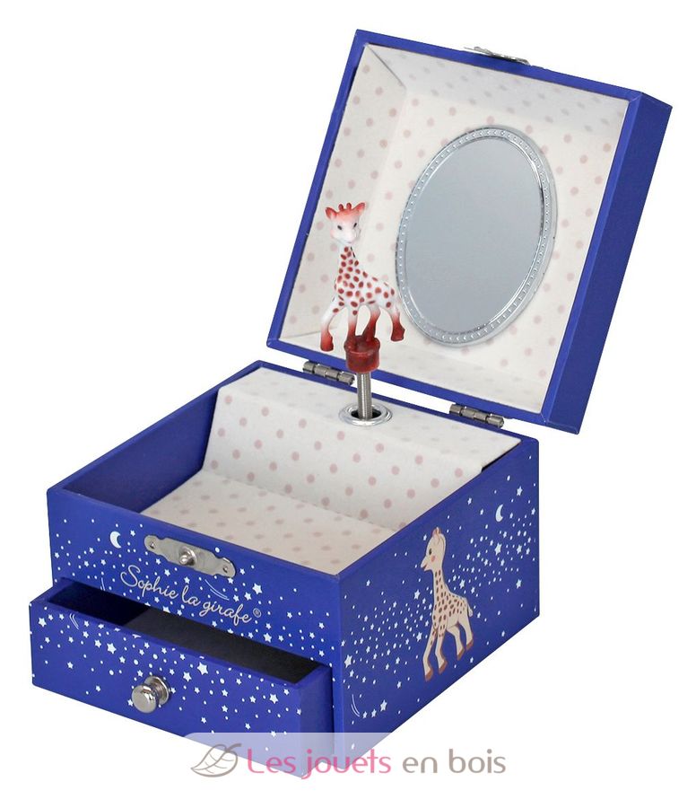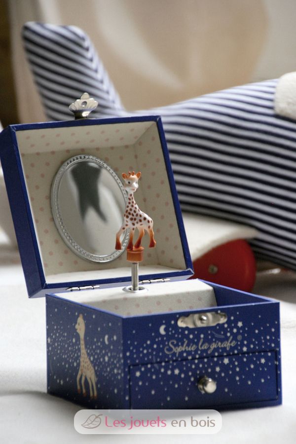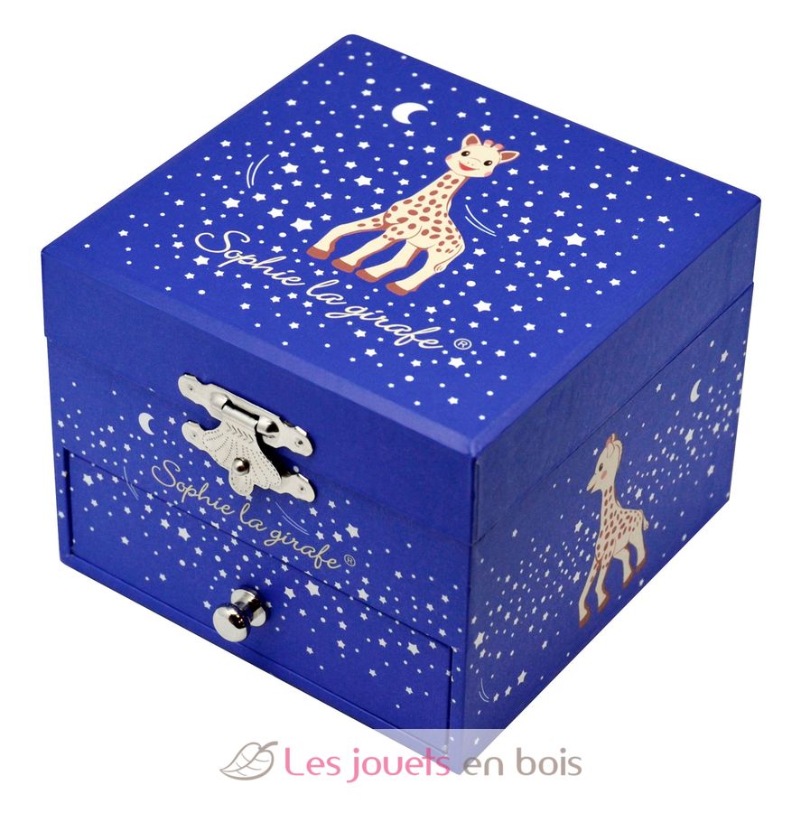 Esta caja, de cartón macizo, tiene un gran compartimento, un cajón para pequeños secretos y un espejo. La figura de la jirafa Sophie gira cuando empieza la música, cuando se abre la caja. Esta caja musical fosforescente brilla en la oscuridad. Música: La Valse d'Amélie Poulain.