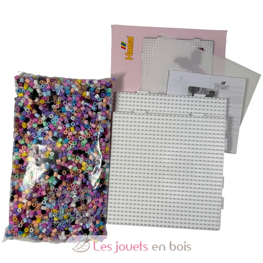 Contenido: Aproximadamente 4000 cuentas de plástico, 2 placas de clavijas, 2 decoraciones brillantes, una hoja de plantilla en color, una hoja de instrucciones y papel para planchar.