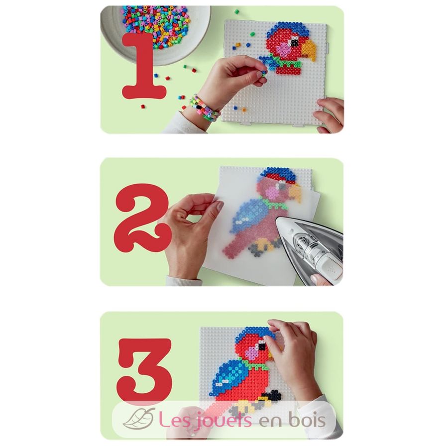 Para utilizarlas como perlas para planchar, simplemente elija un plato, coloque las perlas sobre él y luego fíjelas con la plancha (este paso siempre debe ser realizado por un adulto). Las cuentas Hama también se pueden coser juntas para crear patrones originales.