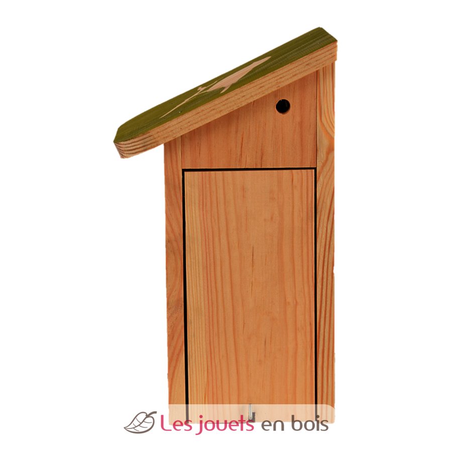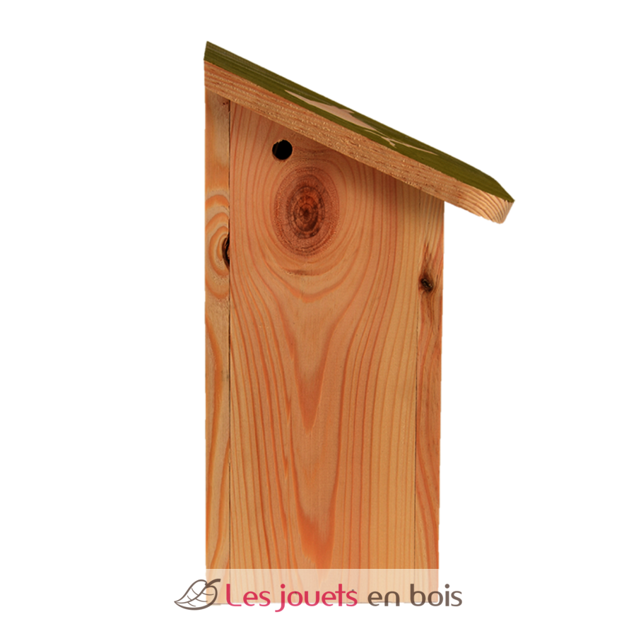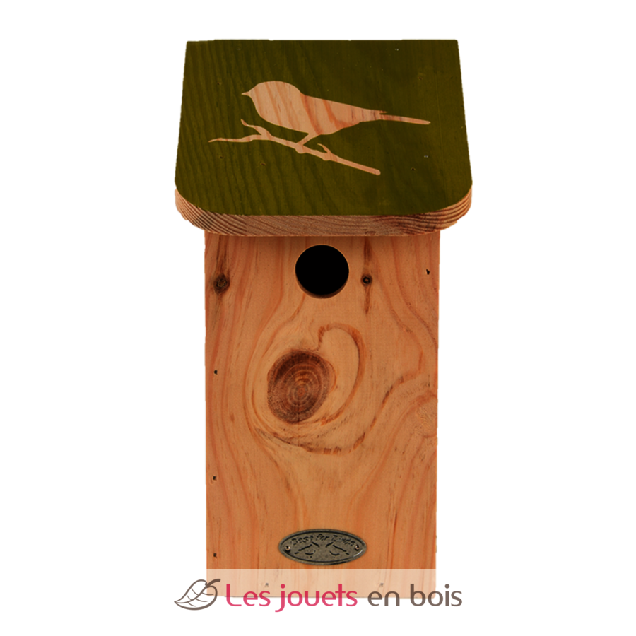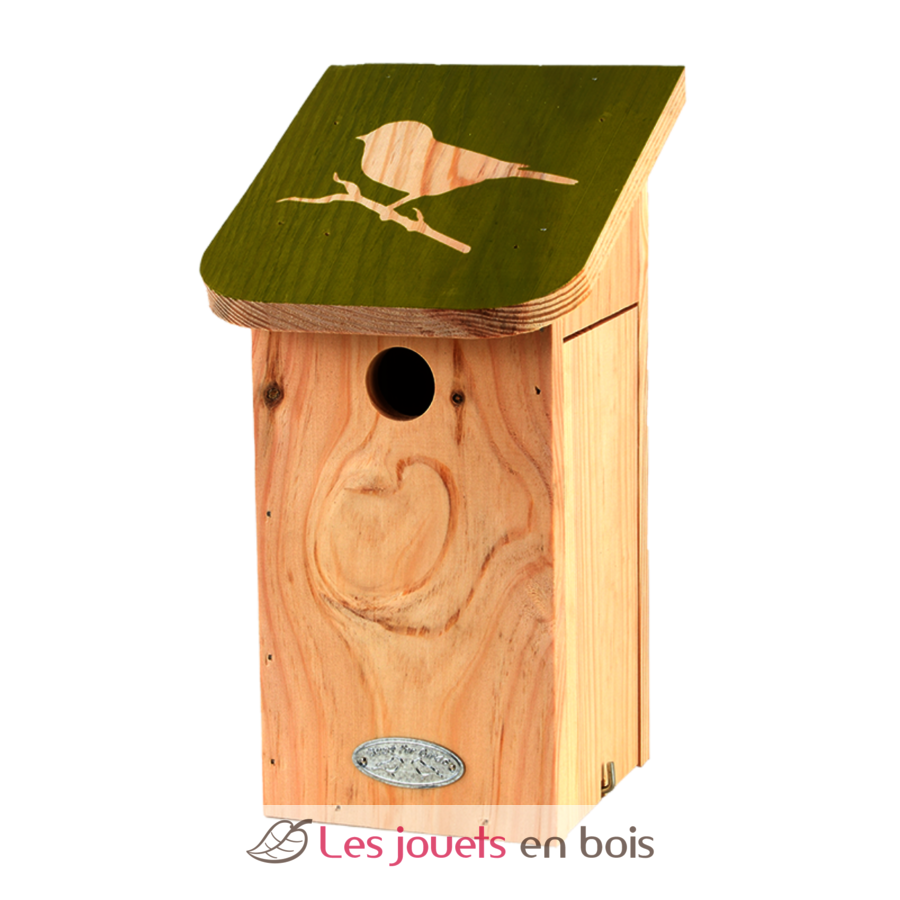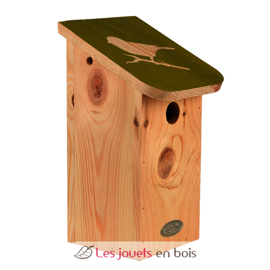 Caja nido para herrerillos fabricada en madera de abeto con certificación FSC, con techo de colores vivos y silueta estampada.