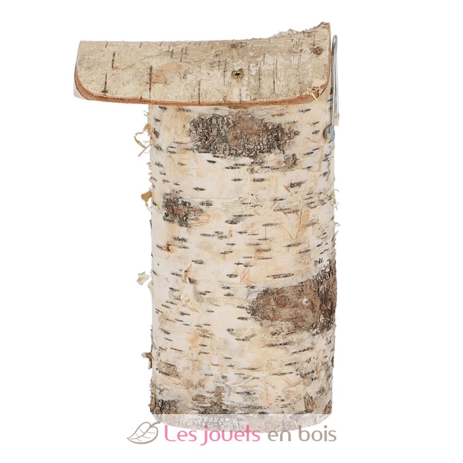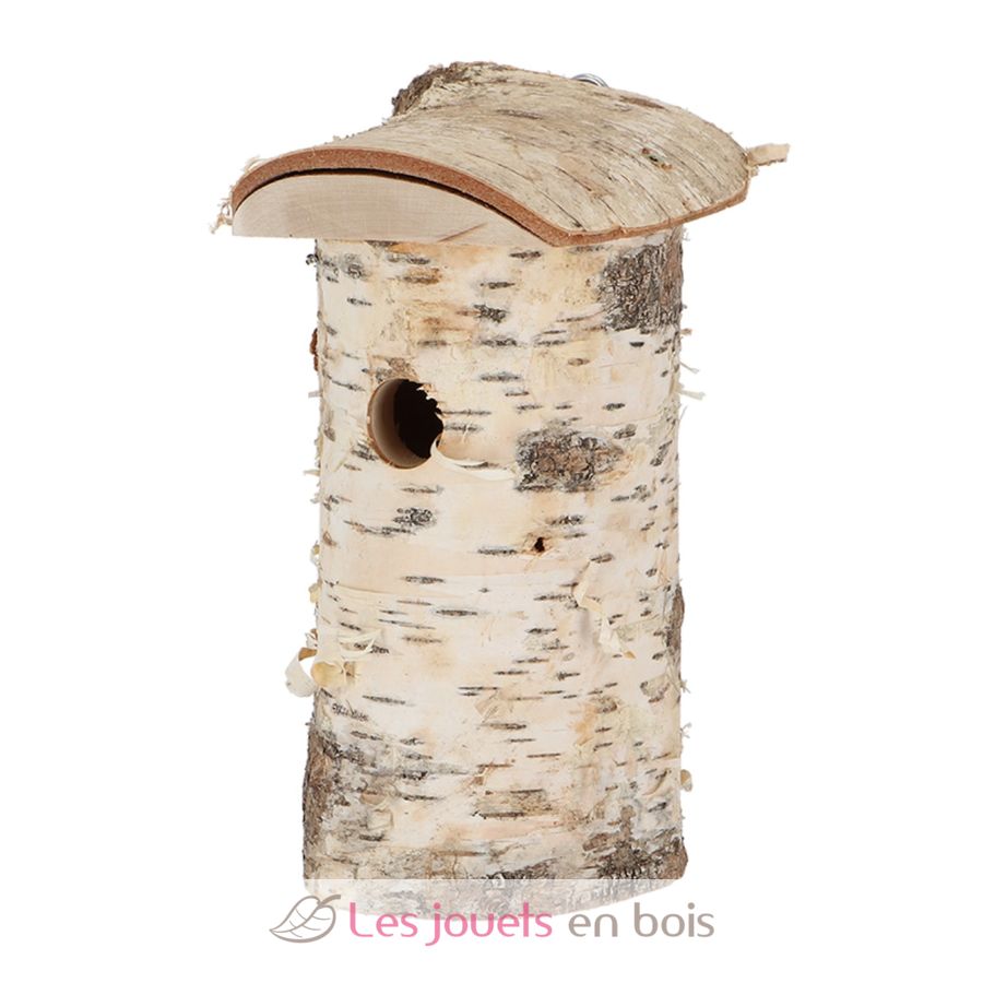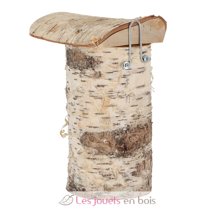 Caja nido para herrerillos hecha de un tronco de madera de abedul, certificado FSC.