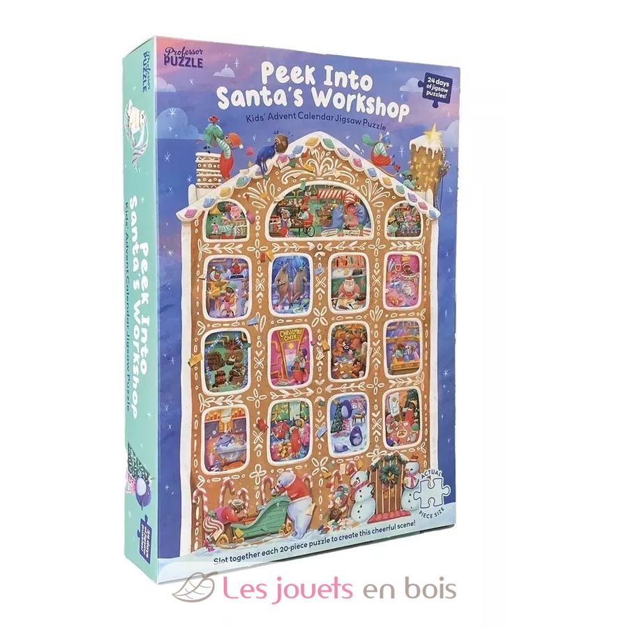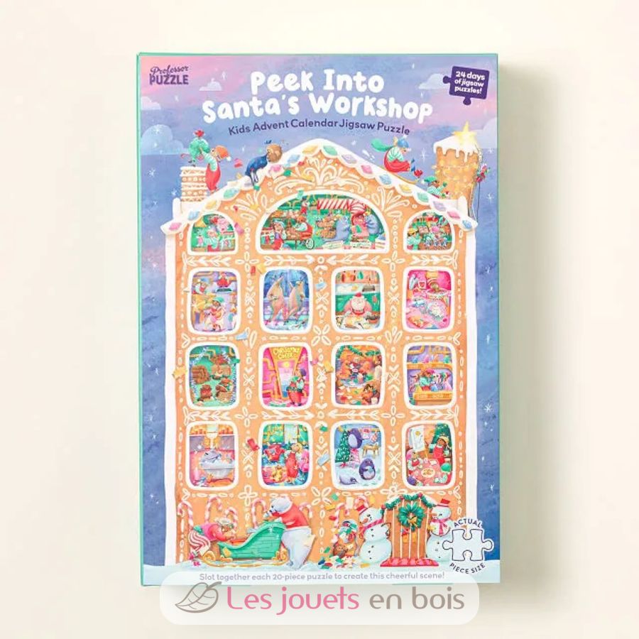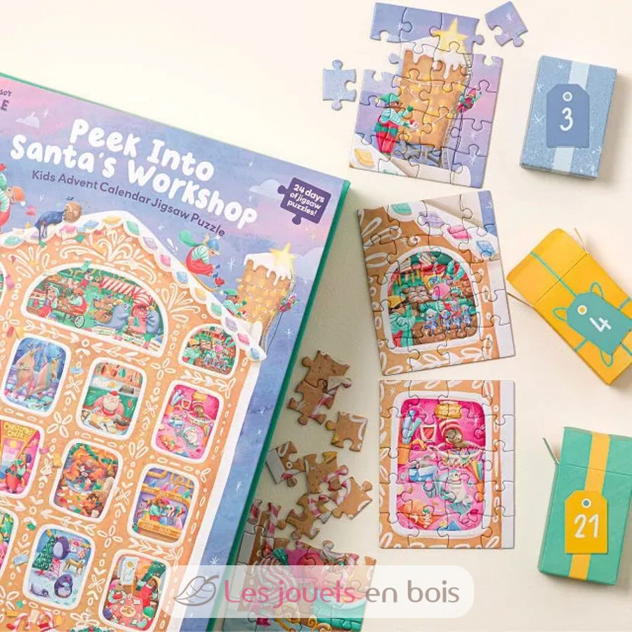 Detrás de cada una de las 24 ventanas del Taller de Papá Noel hay un puzzle de 20 piezas de cartón. Encaja una cada día y luego únelas para crear una escena festiva final.