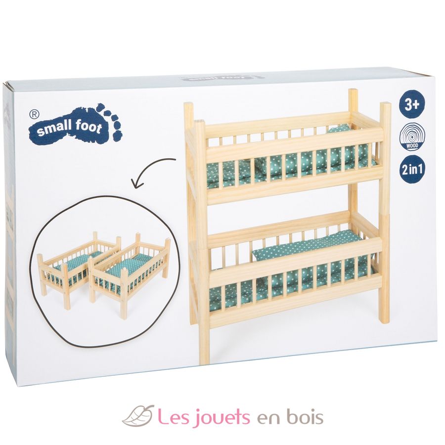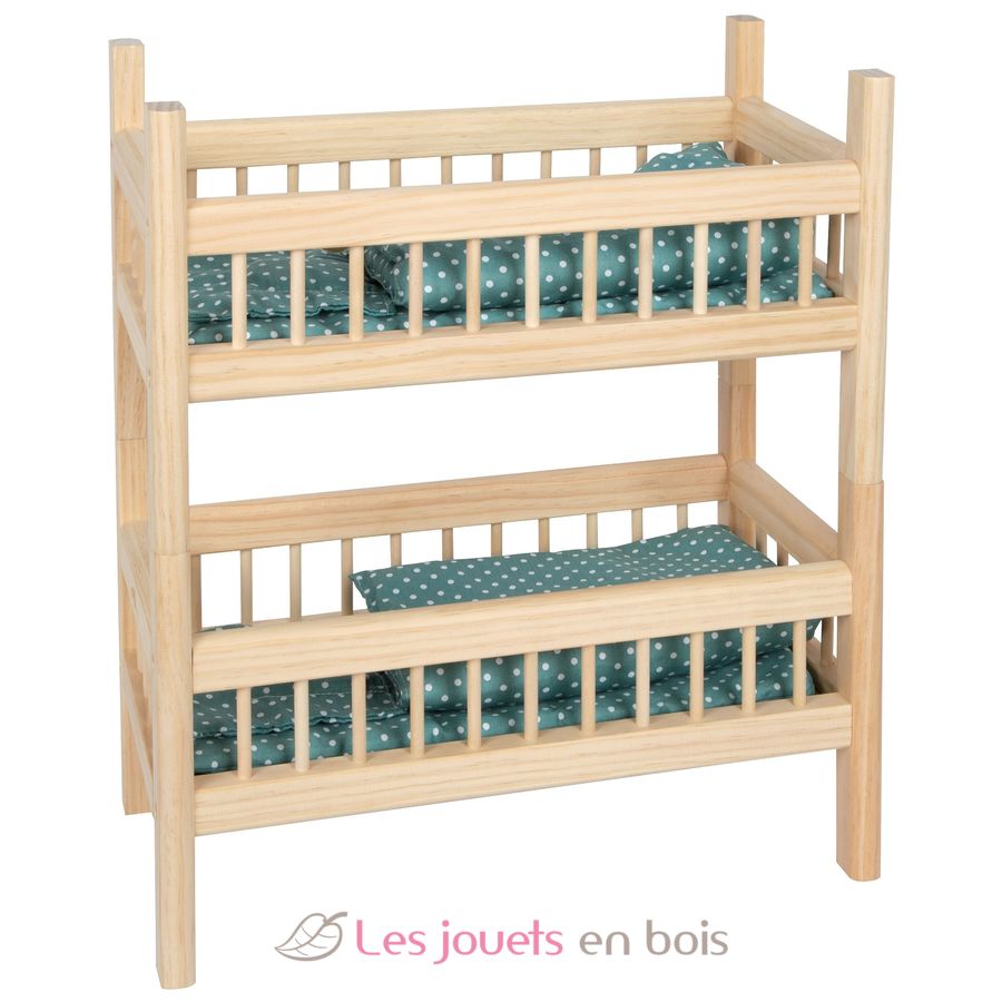 ¡Hora de dormir para muñecas y amigos de peluche! Esta cama alta para muñecas hecha de madera natural robusta ofrece el doble de comodidad para dormir, ya sea como dos camas individuales o apiladas para ahorrar espacio como cama alta.