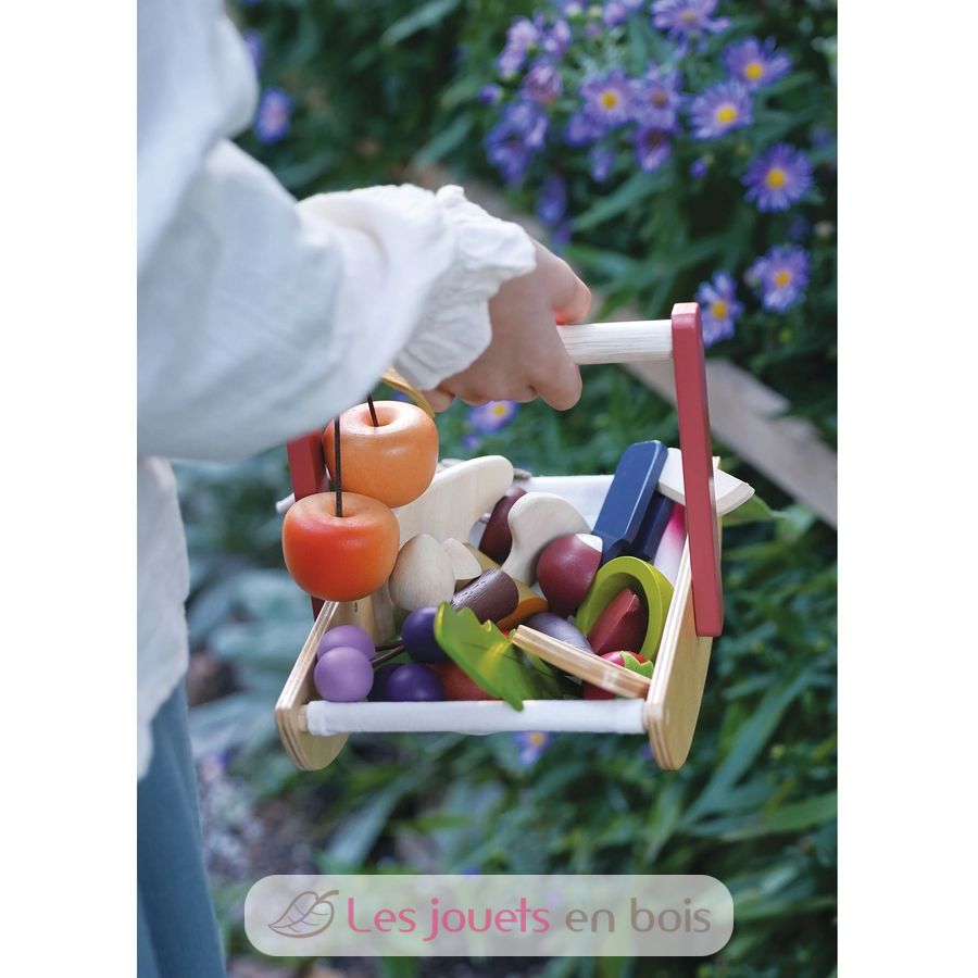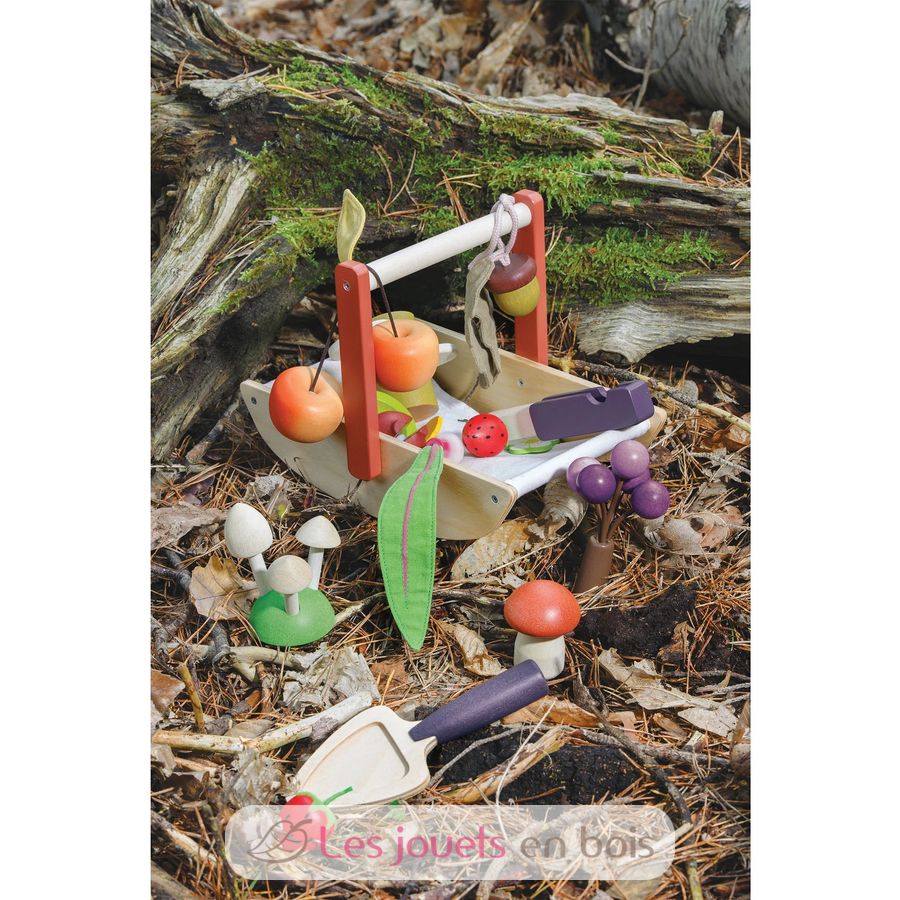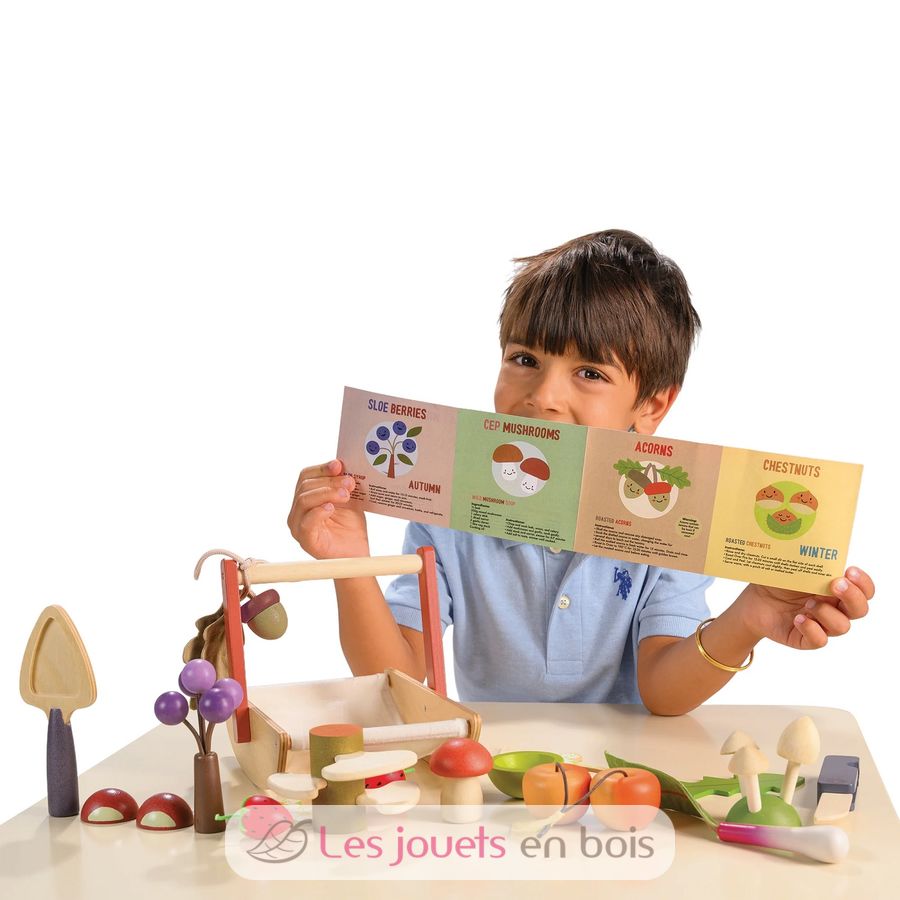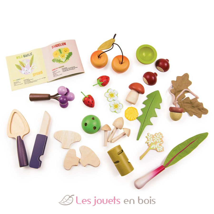 Este juego de simulación incluye un cuchillo plegable de madera y una pala para recoger setas. Tu hijo descubrirá tesoros comestibles que se pueden recolectar durante todo el año en bosques o setos: 2 manzanas silvestres, 2 fresas silvestres, ajo silvestre, flores, 3 setas pequeñas, un hongo porcini, endrinas, una hoja y una flor de diente de león, setas en un tronco y una castaña.