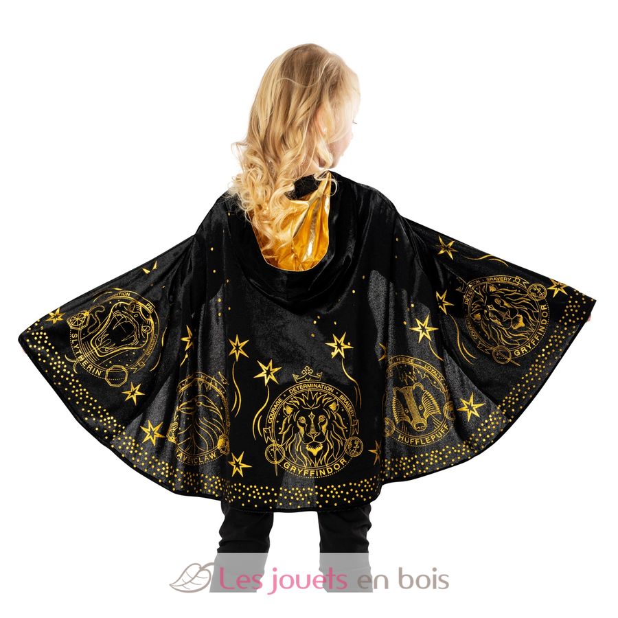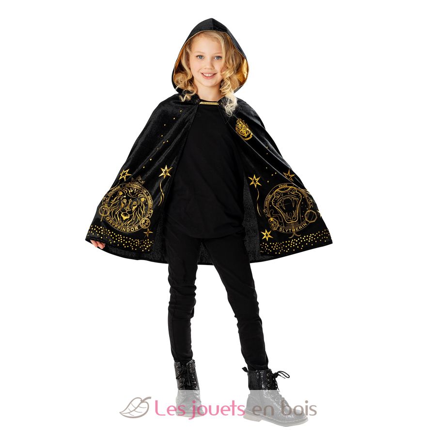 Este disfraz infantil incluye una capa mágica de terciopelo negro decorada con detalles dorados del universo de Hogwarts.