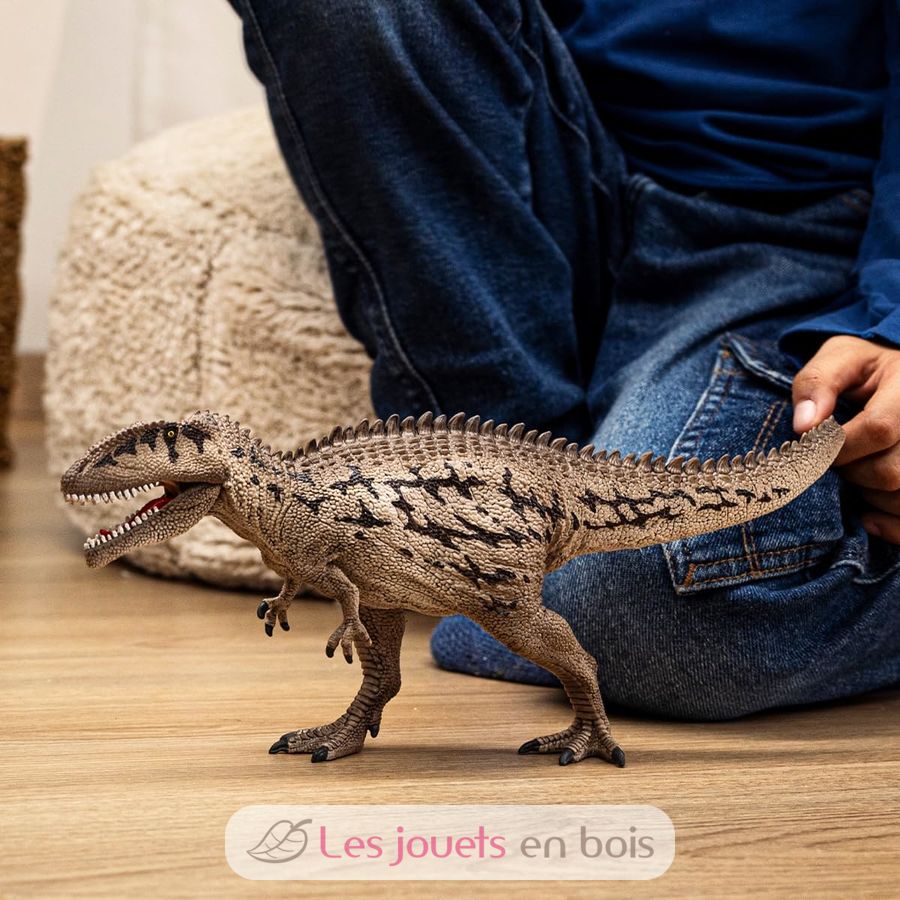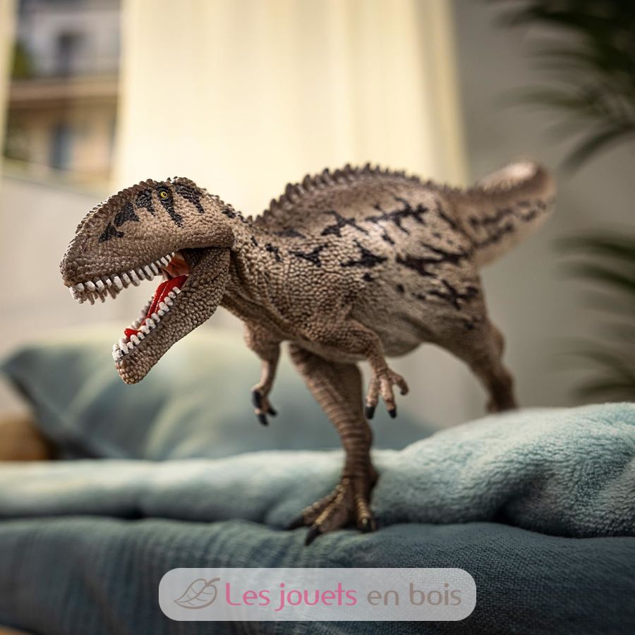 Este Carcharodontosaurus luce una impresionante piel de lagarto de color gris piedra con manchas marrones en forma de estrella. En su espalda luce una cresta puntiaguda que se extiende hasta su largo hocico. Lo más impresionante son los afilados colmillos de su enorme mandíbula móvil. ¡Será mejor que mantengas la distancia!