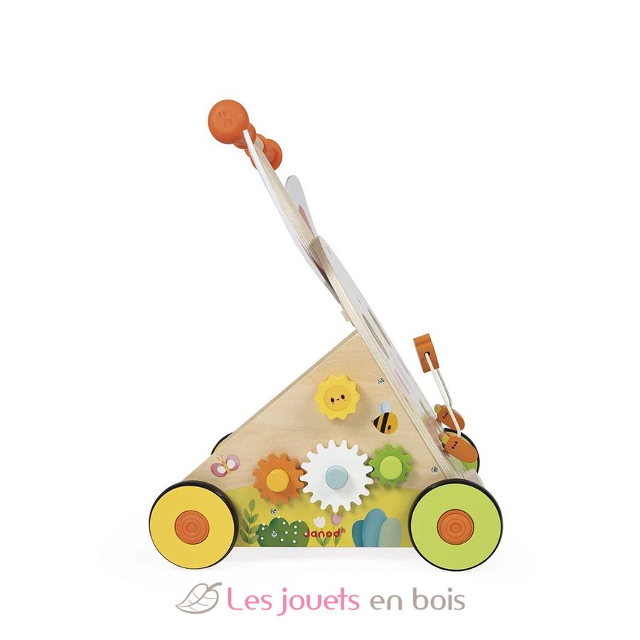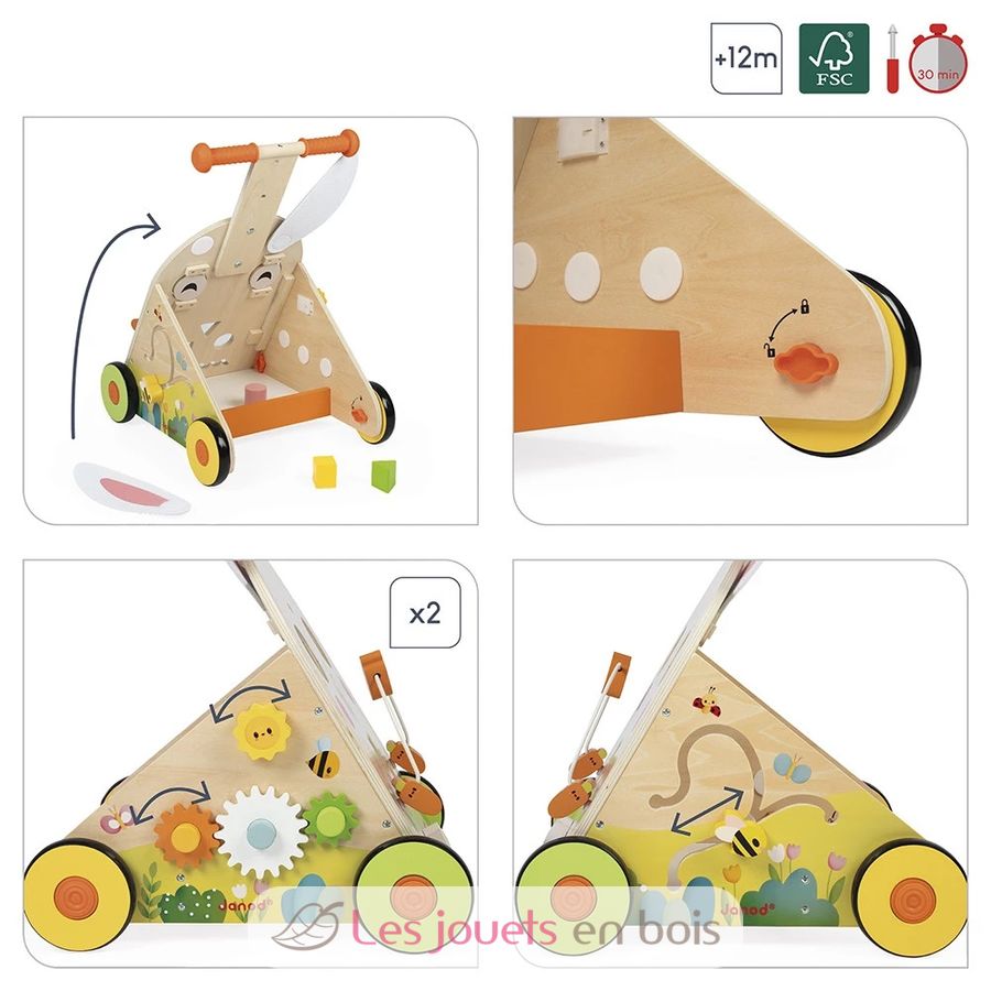 Además ayudarle a andar, este carrito viene con 9 actividades para poner a prueba su motricidad fina y su destreza: circuito en bucle con sus zanahorias, caja de formas tradicionales y ratoncito para deslizarse por un laberinto en la parte delantera, laberinto de abejas en un lado, engranajes y sol sonoro en el otro. Los grandes ojos de nuestro conejo giran y sus mejillas son de fieltro, al igual que sus orejas, para desarrollar el sentido del tacto del niño.