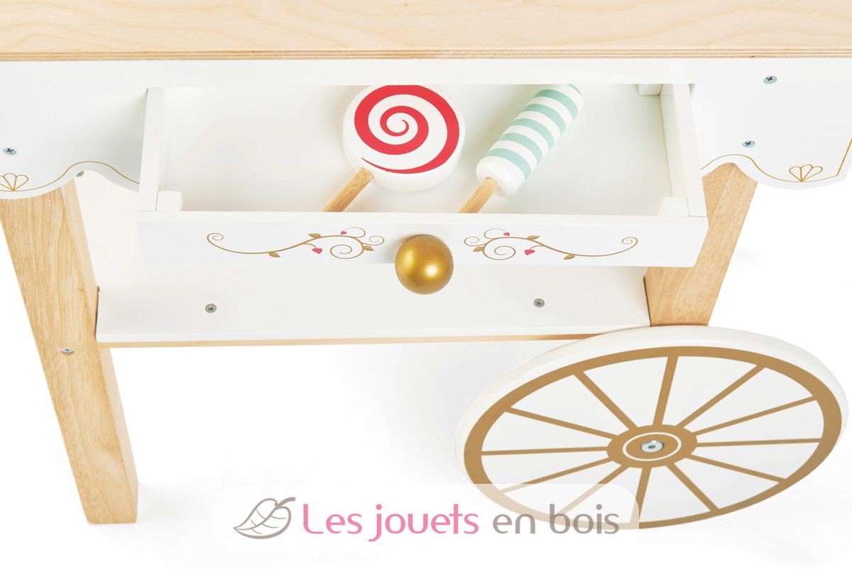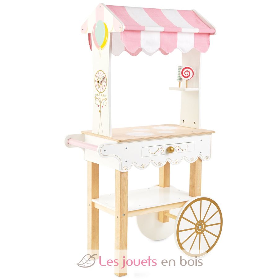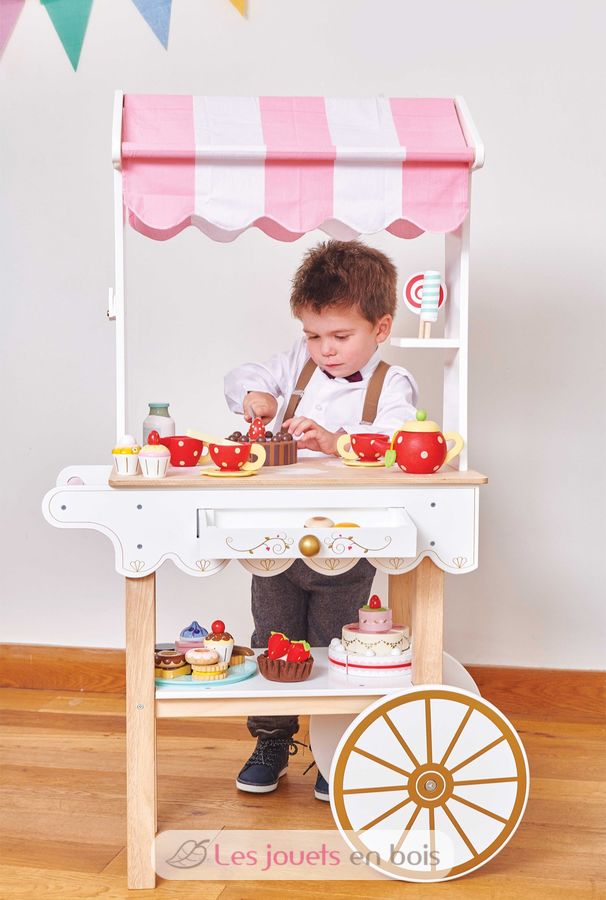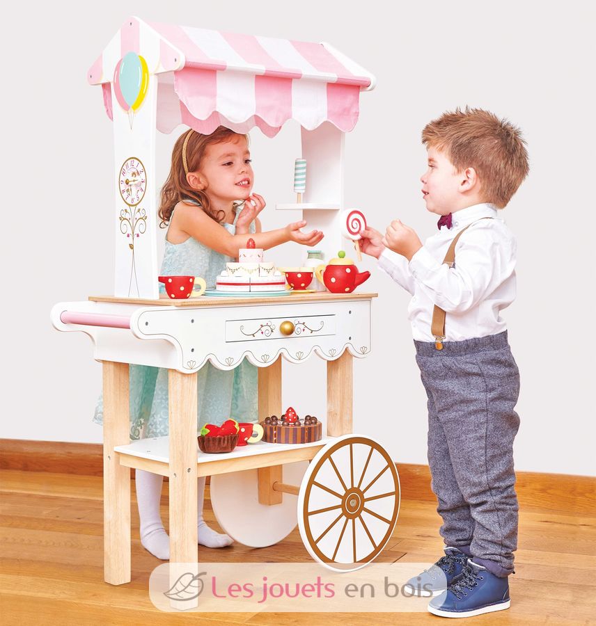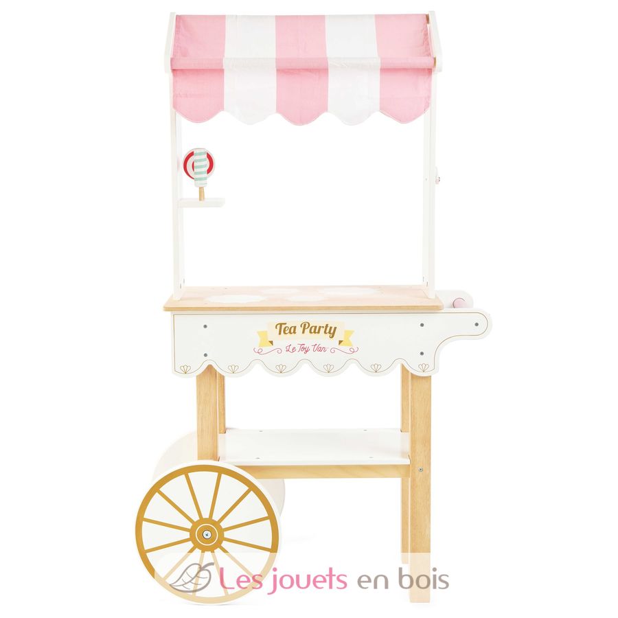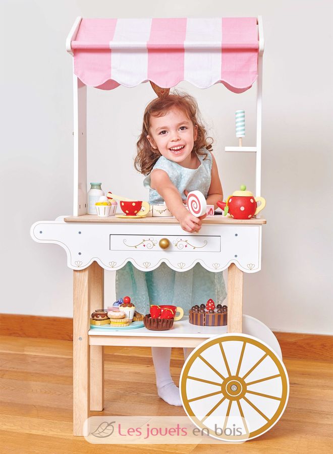 ¡A los peques de la casa les encantará jugar a ser vendedor ambulante con este simpático carrito de té y caramelos de Le Toy Van! Este bonito carrito de madera con grandes ruedas incluye un menú, un reloj ajustable, un cajón y 2 piruletas grandes. El resto de accesorios se venden por separado. Medidas una vez montado: Ancho 68,5 x Prof. 32,5 x Alt. 114,0 cm. Referencia TV324.