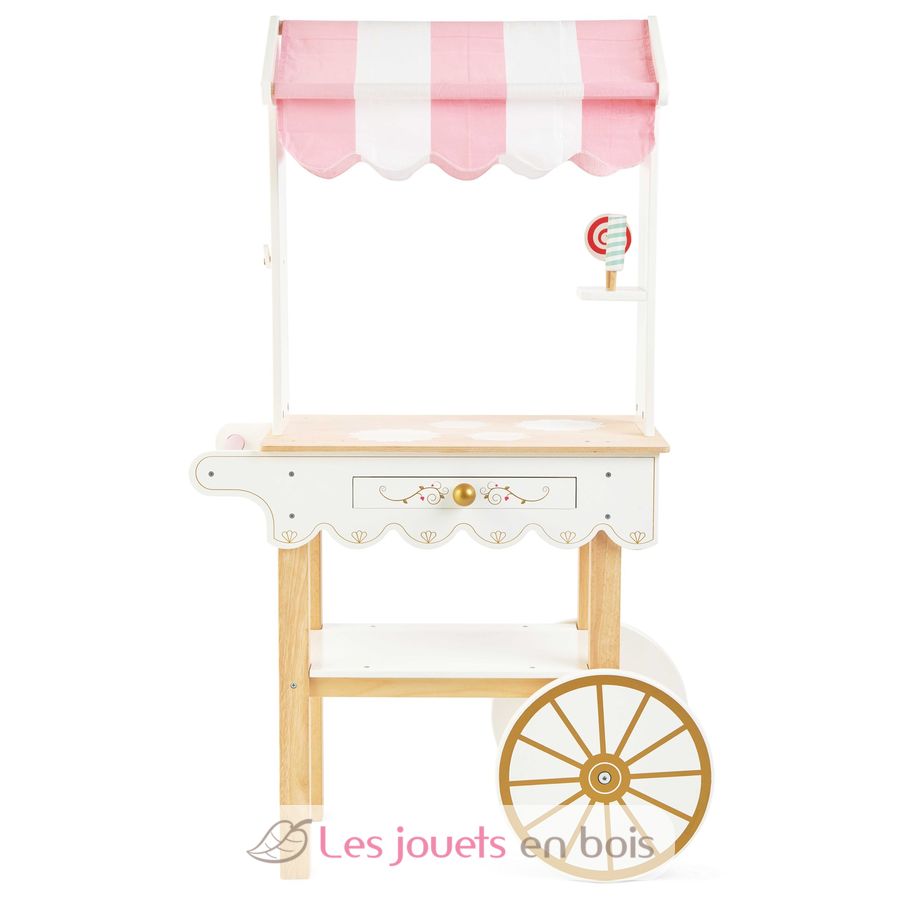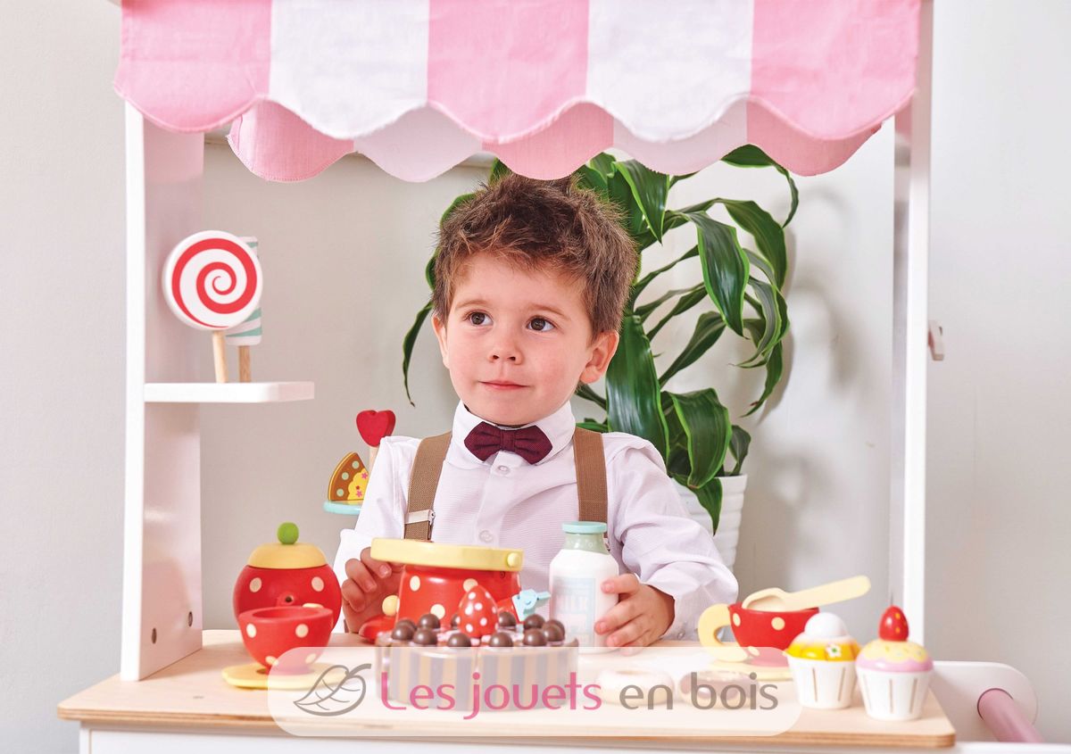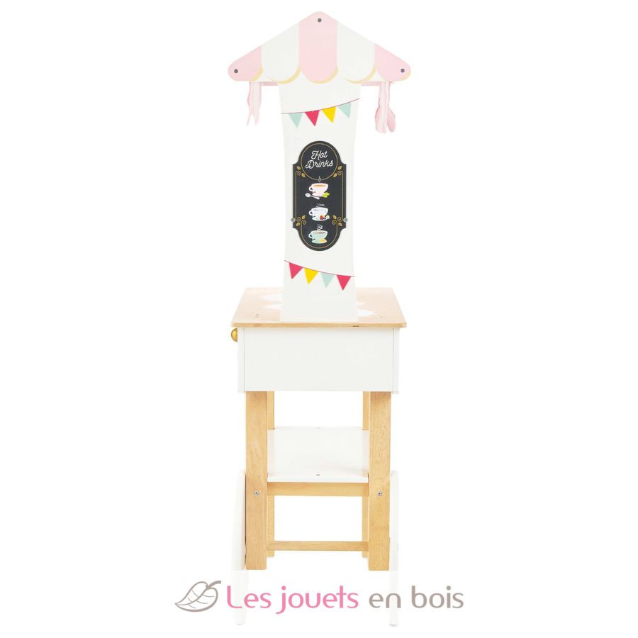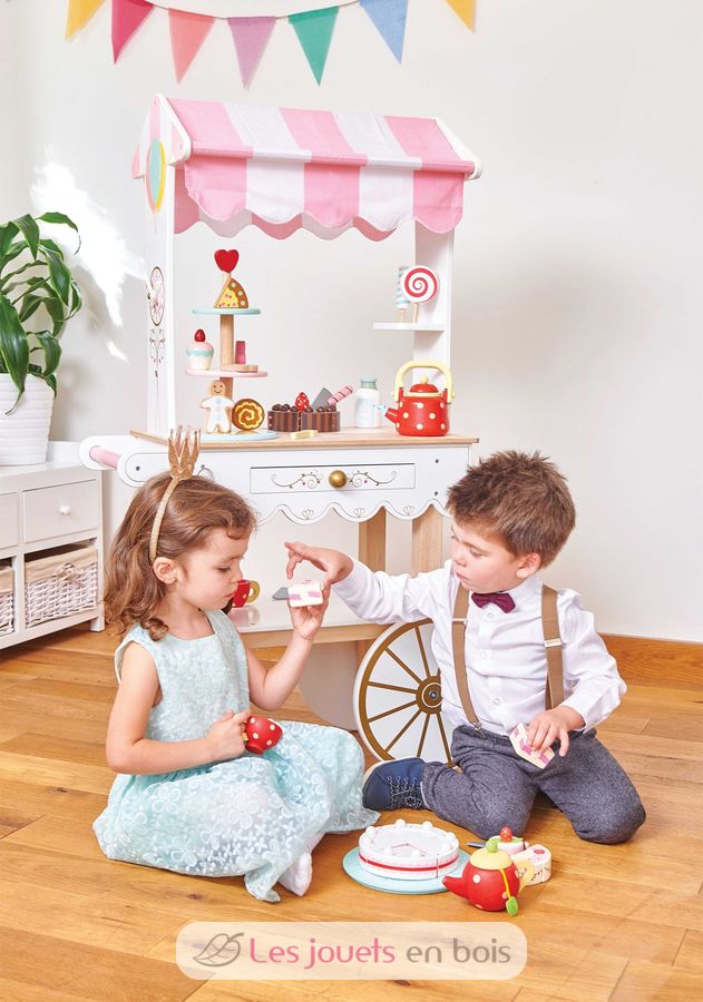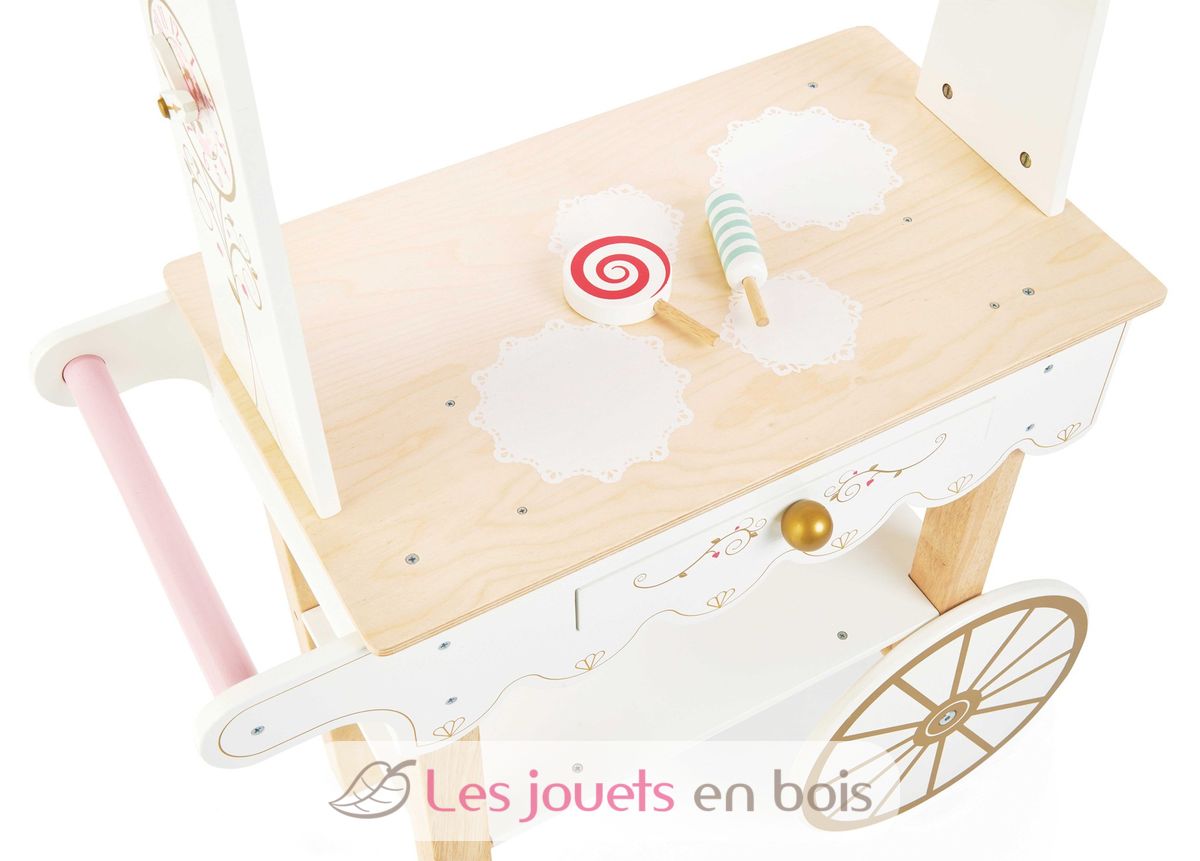 ¡A los peques de la casa les encantará jugar a ser vendedor ambulante con este simpático carrito de té y caramelos de Le Toy Van! Este bonito carrito de madera con grandes ruedas incluye un menú, un reloj ajustable, un cajón y 2 piruletas grandes. El resto de accesorios se venden por separado. Medidas una vez montado: Ancho 68,5 x Prof. 32,5 x Alt. 114,0 cm. Referencia TV324.