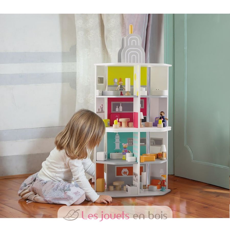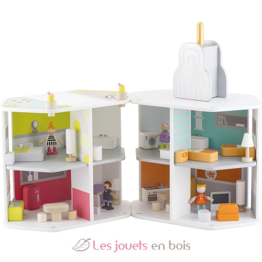 Esta casa de muñecas se compone de dos módulos apilables o yuxtaponibles para una mayor jugabilidad. Está equipada con muebles y cuatro figuras para dar rienda suelta a la imaginación.