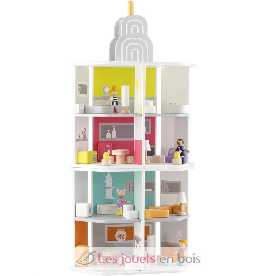 Este extraordinario rascacielos, con una rica colección de elementos de diseño y acabados meticulosos, es una original casa de muñecas de madera.