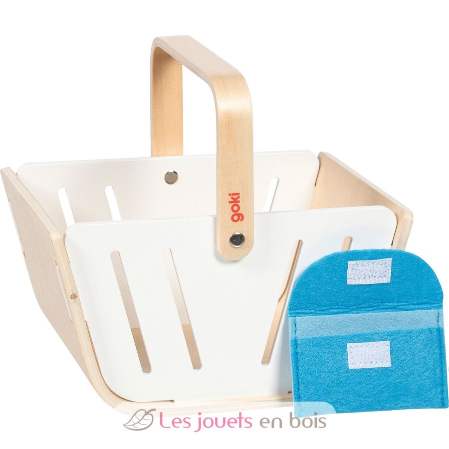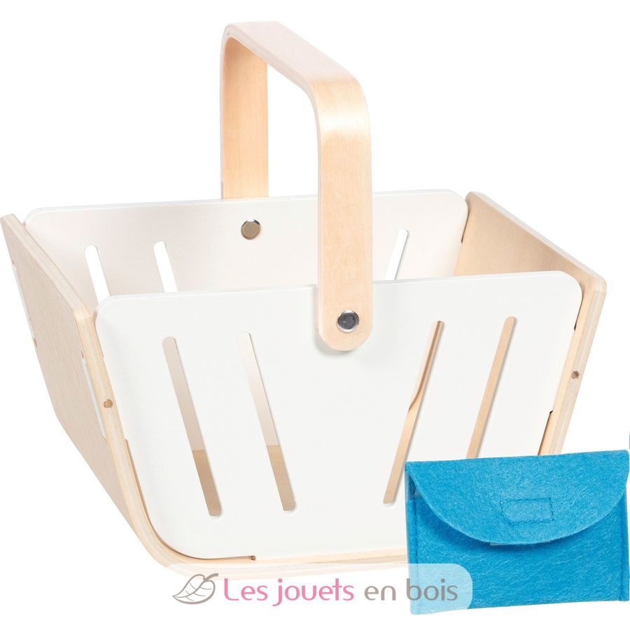 Esta cesta de madera es perfecta para jugar a ser tendero. Incluye un monedero de fieltro azul y es el complemento ideal para cualquier tienda de juguete.