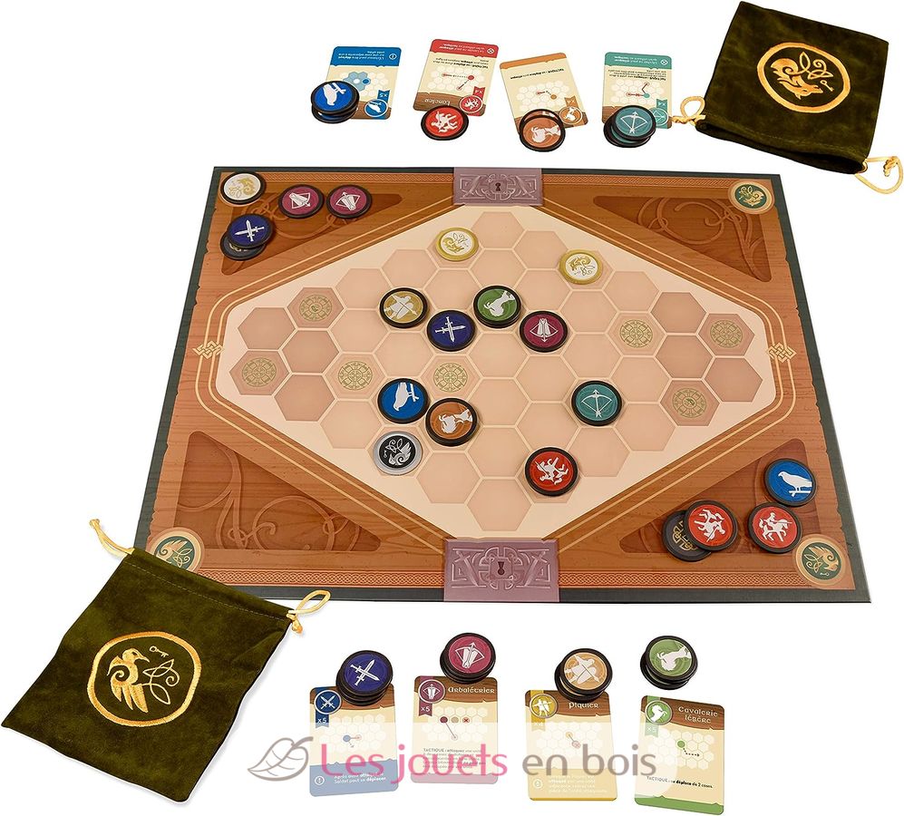 En este juego de estrategia, cada jugador lidera un ejército de 4 unidades, cada una con una táctica de combate única. En cada turno, los jugadores sacan de su bolsa tres piezas que representan a estas unidades y luego deben definir la mejor estrategia para usarlas: desplegar la unidad o reforzar la que ya está en su lugar, maniobrar o incluso atacar... Tendrás que imaginar planes plan de acción para reclutar más tropas, limitar tus pérdidas, administrar tus unidades en el campo pero también en reserva. La victoria pertenecerá al jugador que logre controlar primero seis territorios.