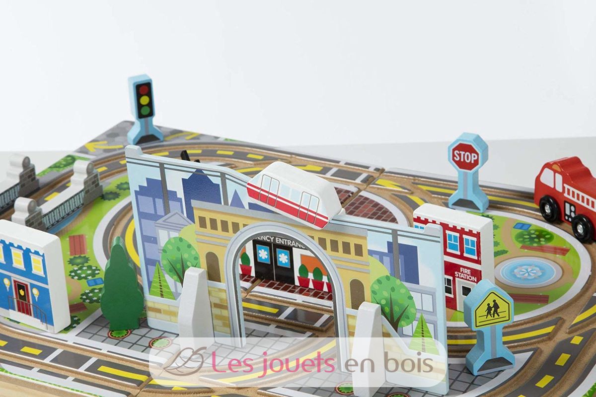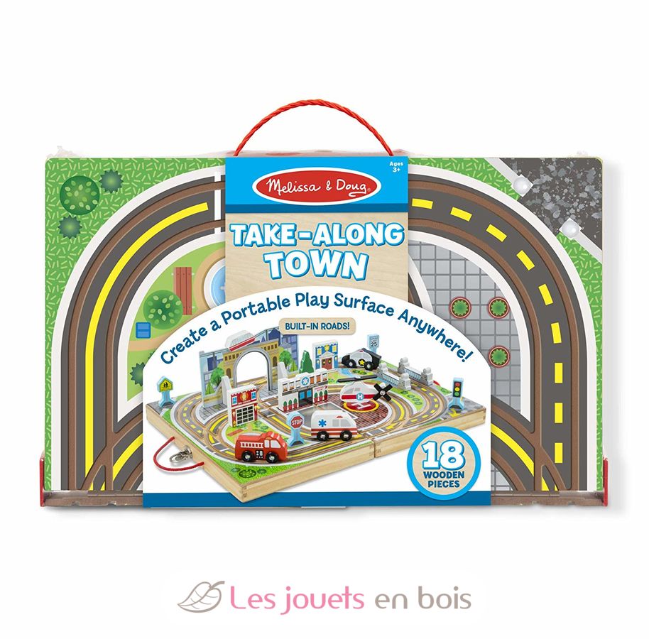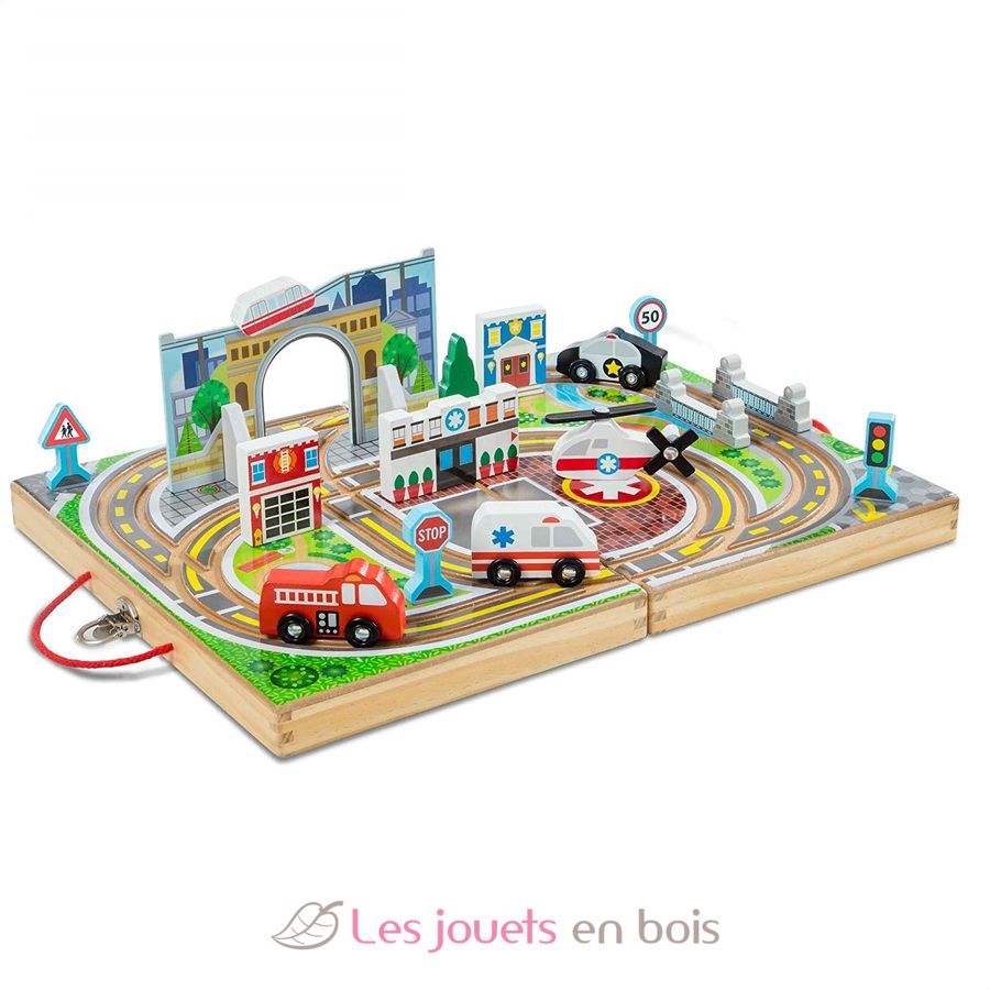 ¡Crea un parque infantil en cualquier lugar! Este set de madera con carreteras incorporadas incluye 4 vehículos de rescate, un árbol, 4 señales de tráfico, soportes, un túnel y 3 edificios. Una pista de coche de ciudad y maleta que el niño puede llevar a cualquier parte!