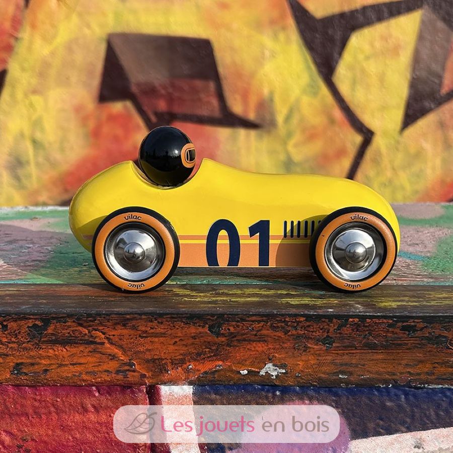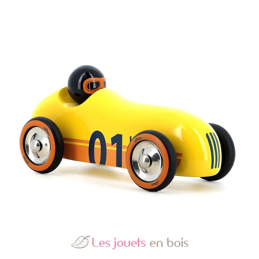 Coche Old Sport amarilla, un juguete de madera para empujar fabricado por Vilac. Número de artículo 2290Y.