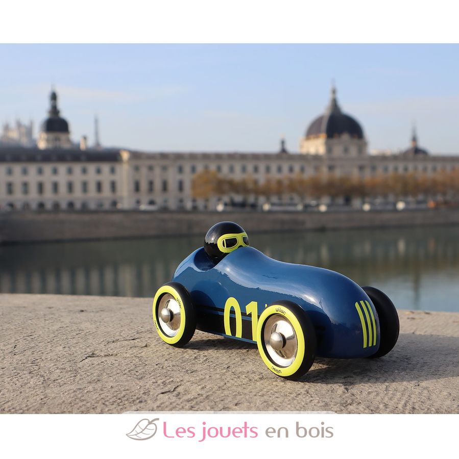 Coche Old Sport azul medianoche, un juguete de madera para empujar fabricado por Vilac. Número de artículo 2290K.