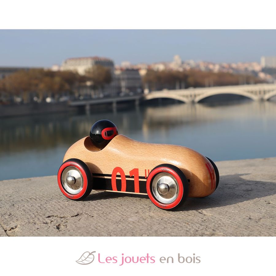 Este coche está hecho de madera de haya dura y fue producido en el taller de Vilac, en el corazón de las montañas del Jura, la cuna de los juguetes franceses.