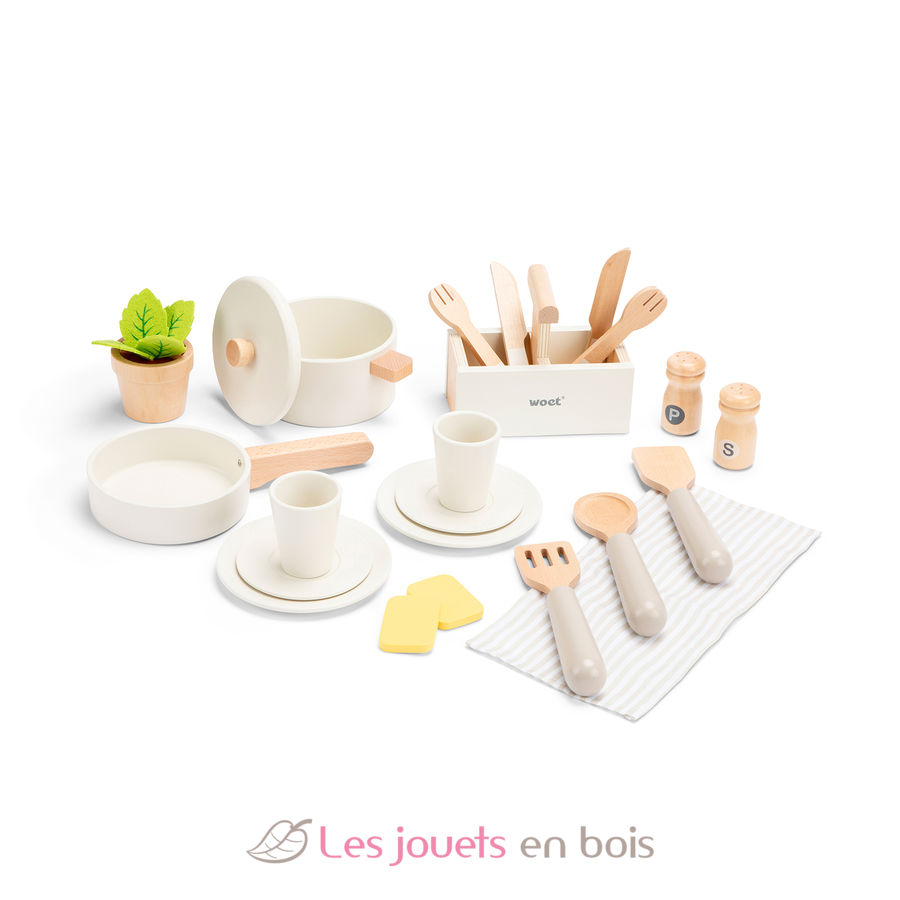 El juguete incluye más de 20 accesorios de madera, desde ollas y sartenes hasta platos, utensilios y una maceta de madera con hierbas, para horas de juego significativo.