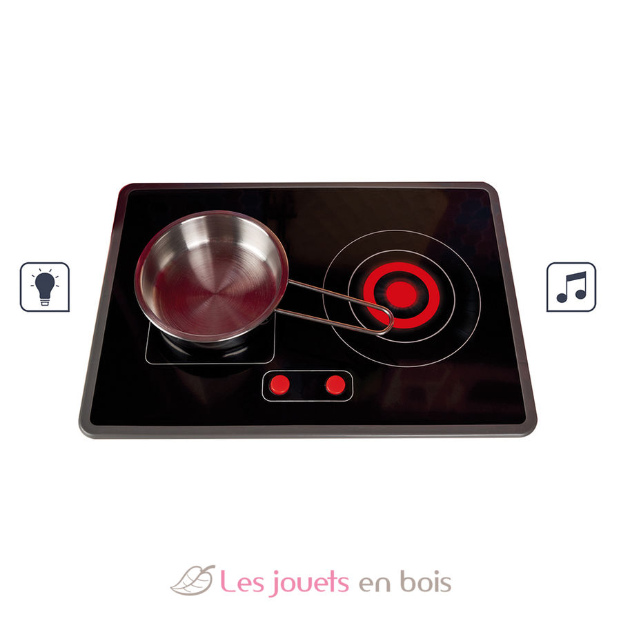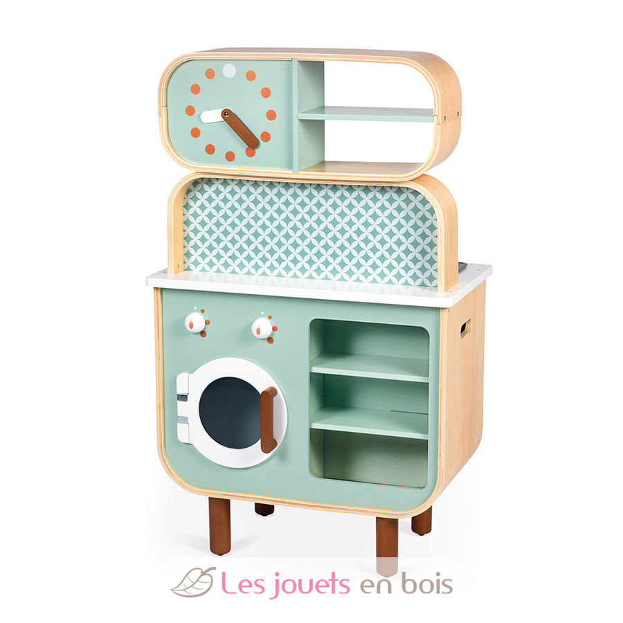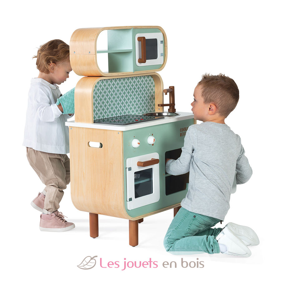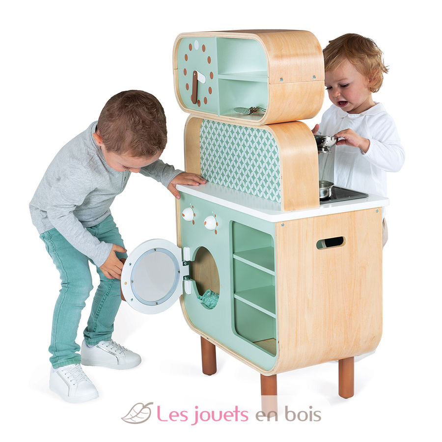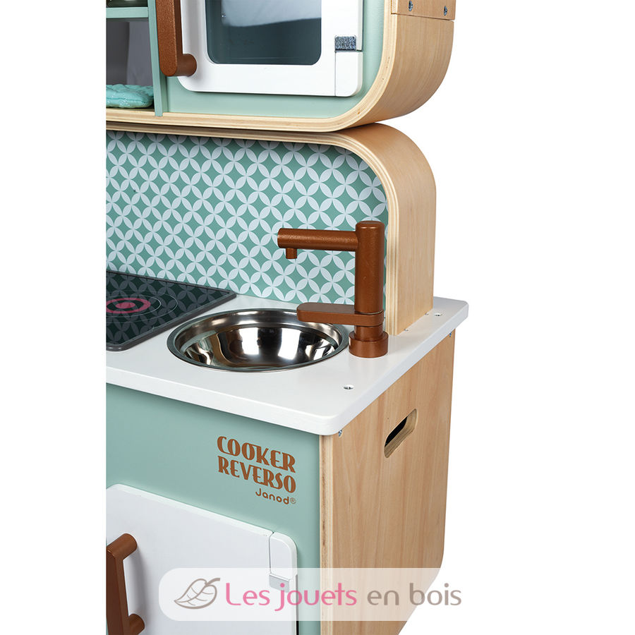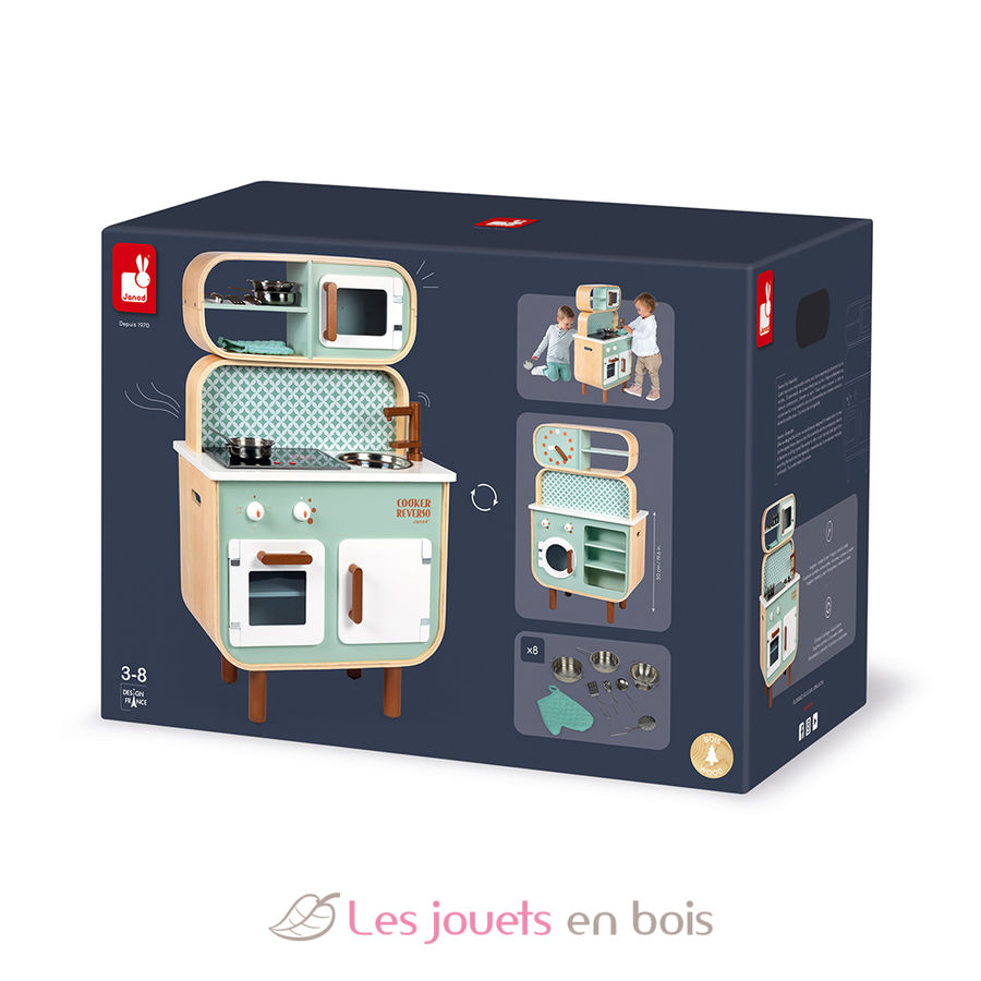 Colores suaves, un estilo único y moderno y un gran número de funciones ¡A tus hijos les va a encanta esta Gran Cocina Cooker Reverso! Esta cocina ofrece numerosas posibilidades de juego, ya sea o con amitos. Está equipada con reloj de aguja, un fregadero de metal y una placa de inducción sonora y luminosa. Basta con pulsar una vez los botones rojos para que se enciendan las placas, y una segunda vez para oír el sonido del agua hirviendo. El sonido y la luz se apagan automáticamente a los 30 segundos o al pulsarlos por tercera vez. Por un lado, cuenta con 2 mandos giratorios con efectos sonoros, un horno, un microondas, un armario con puertas magnéticas. Por el otro, con 2 mandos con efectos sonoros, una lavadora y estantes. Para completar esta cocina, se incluyen 7 accesorios de metal: 1 sartén, 1 cacerola, 1 escurridor, 1 cuchara, 1 espátula, 1 espumadera, 1 cuchara para pasta y 1 manoplas de tela. ¡No les faltará de nada para preparar deliciosas comidas! Altura de la encimera: 50 cm. Gran Cocina Cooker Reverso, una cocina de madera de la marca Janod. Referencia J06594.