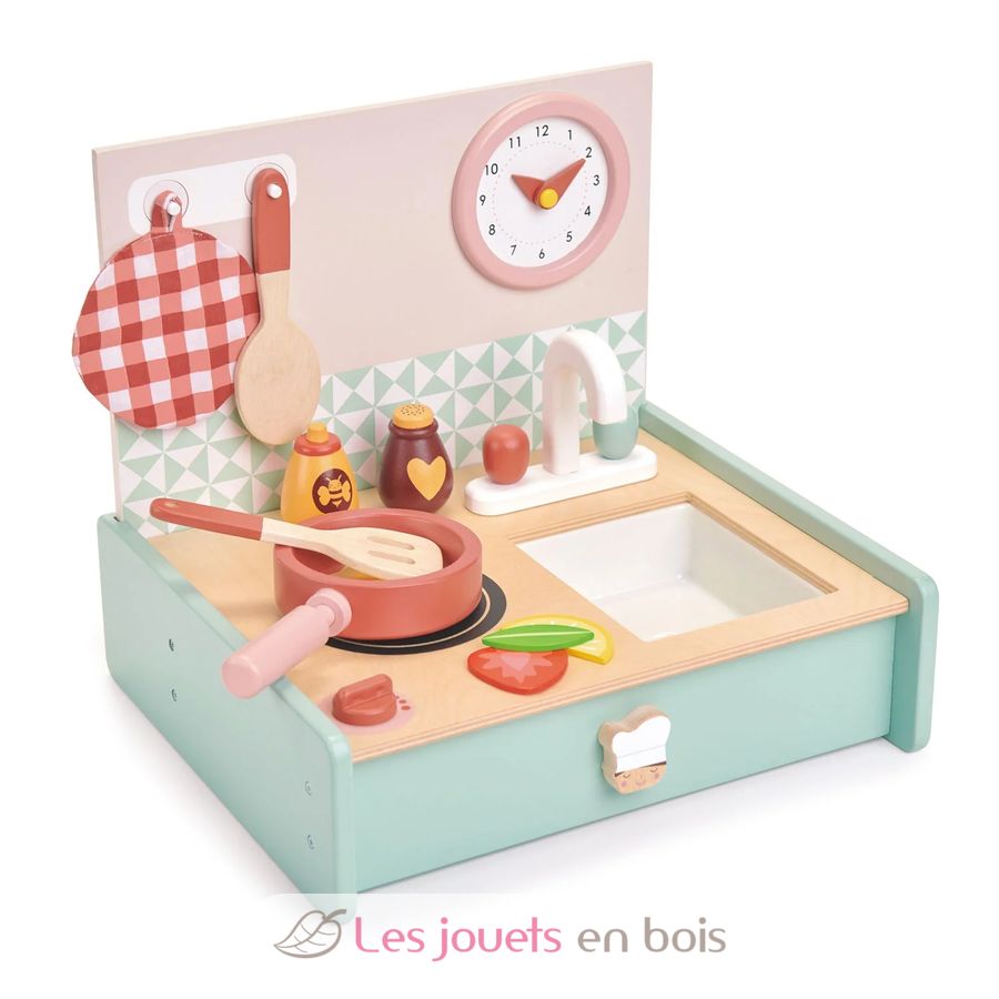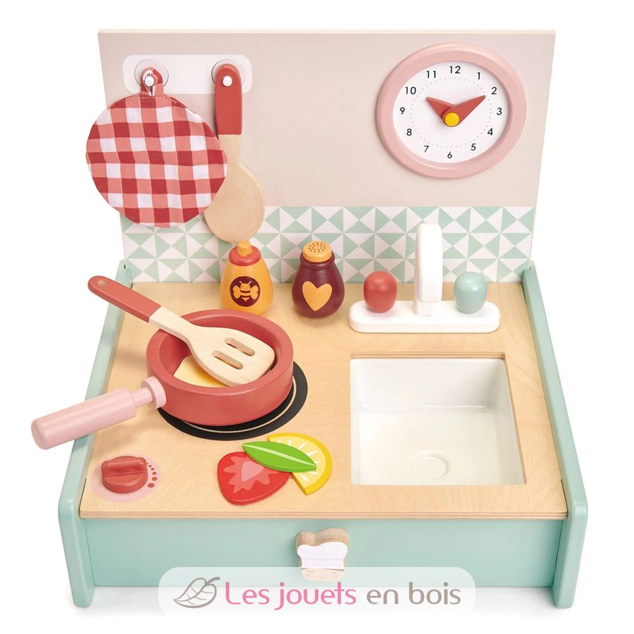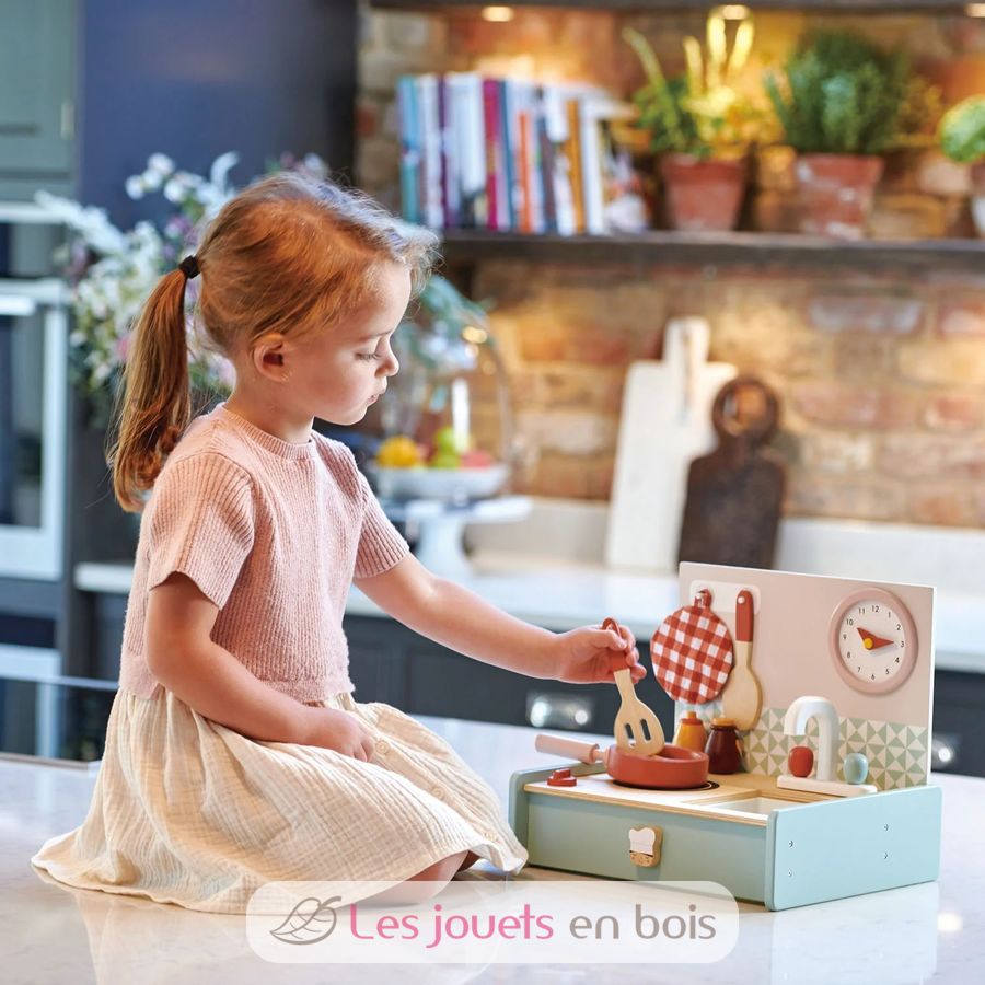Una cocinita portátil y plegable con placa de cocina, dial que suena y un bonito reloj con manecillas móviles que enseña a leer la hora.