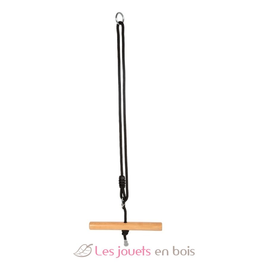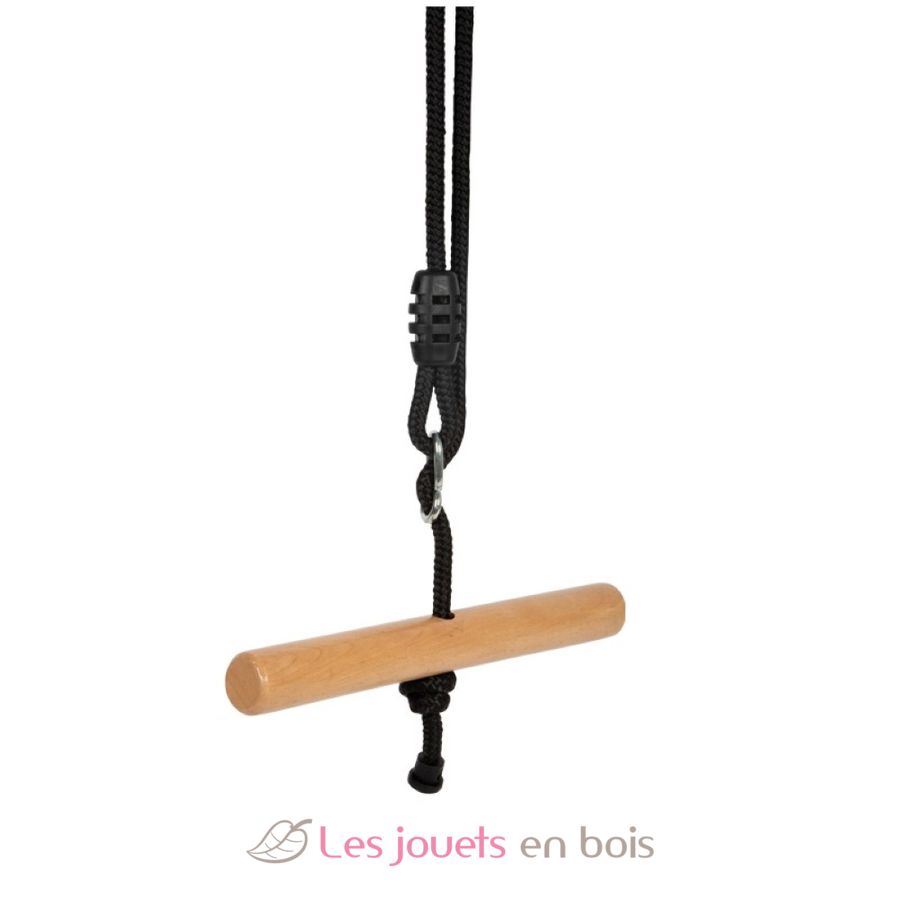 Con cuerdas de longitud regulable y argolla metálicas para montar y desmontar rápidamente el trapecio. Trapecio de madera maciza barnizada de color natural y cuerdas de material resistente a la intemperie, ideal para uso en exteriores.