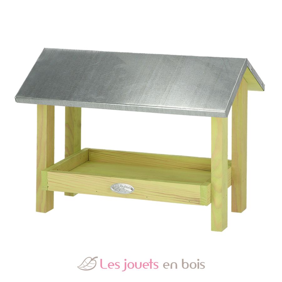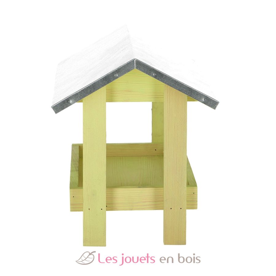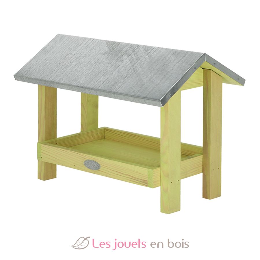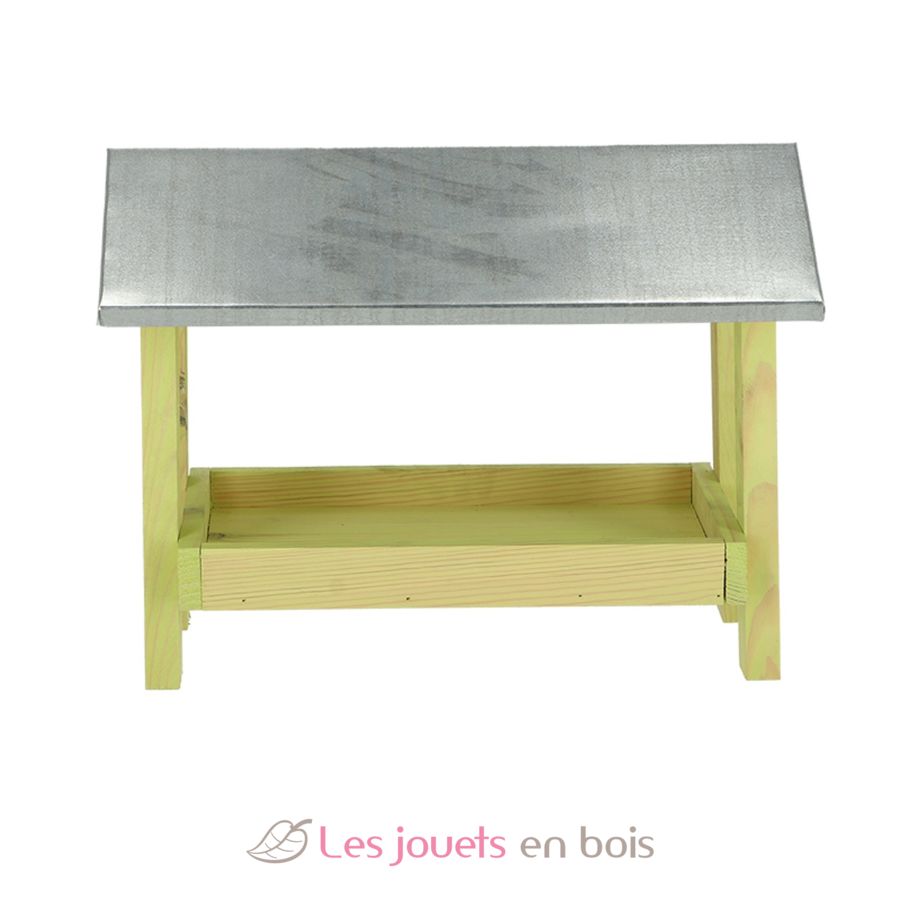 Comedero de suelo para pájaros fabricada en madera de pino con techo de zinc.